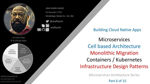of presentation & tutorial ARAF KARSH HAMID Co-Founder / CTO MetaMagic Global Inc., NJ, USA @arafkarsh arafkarsh AI / ML Generative AI LLMs, RAG 6+ Years Microservices Blockchain 8 Years Cloud Computing 8 Years Network & Security 8 Years Distributed Computing 1 Microservices Cell based Architecture Monolithic Migration Containers / Kubernetes Infrastructure Design Patterns Building Cloud Native Apps Microservices Architecture Series Part 6 of 15
