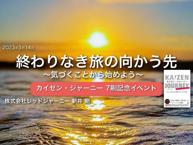 終わりなき旅の向かう先 ~気づくことから始めよう~ 2023/3/14 DevLOVEイベント カイゼン・ジャーニー 7刷記念イベント https://devlove.doorkeeper.jp/events/152704 #devlove #kaizenj
