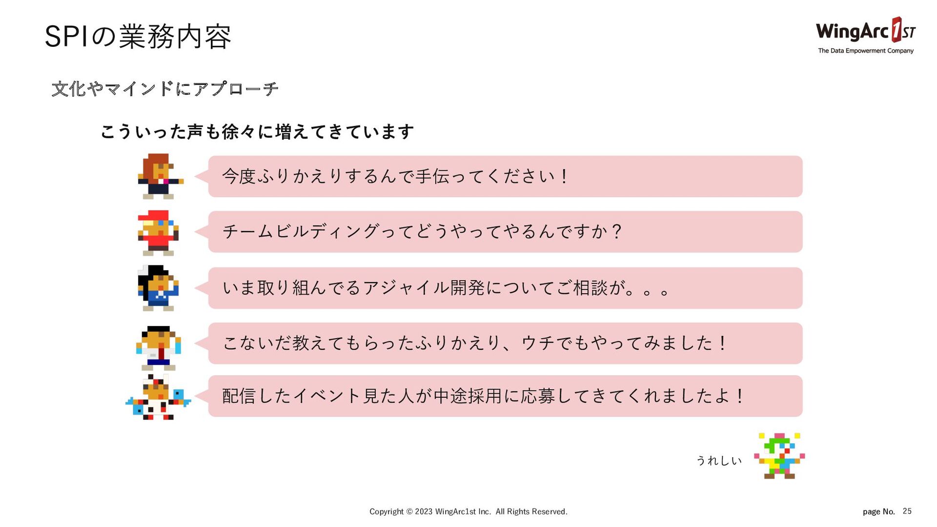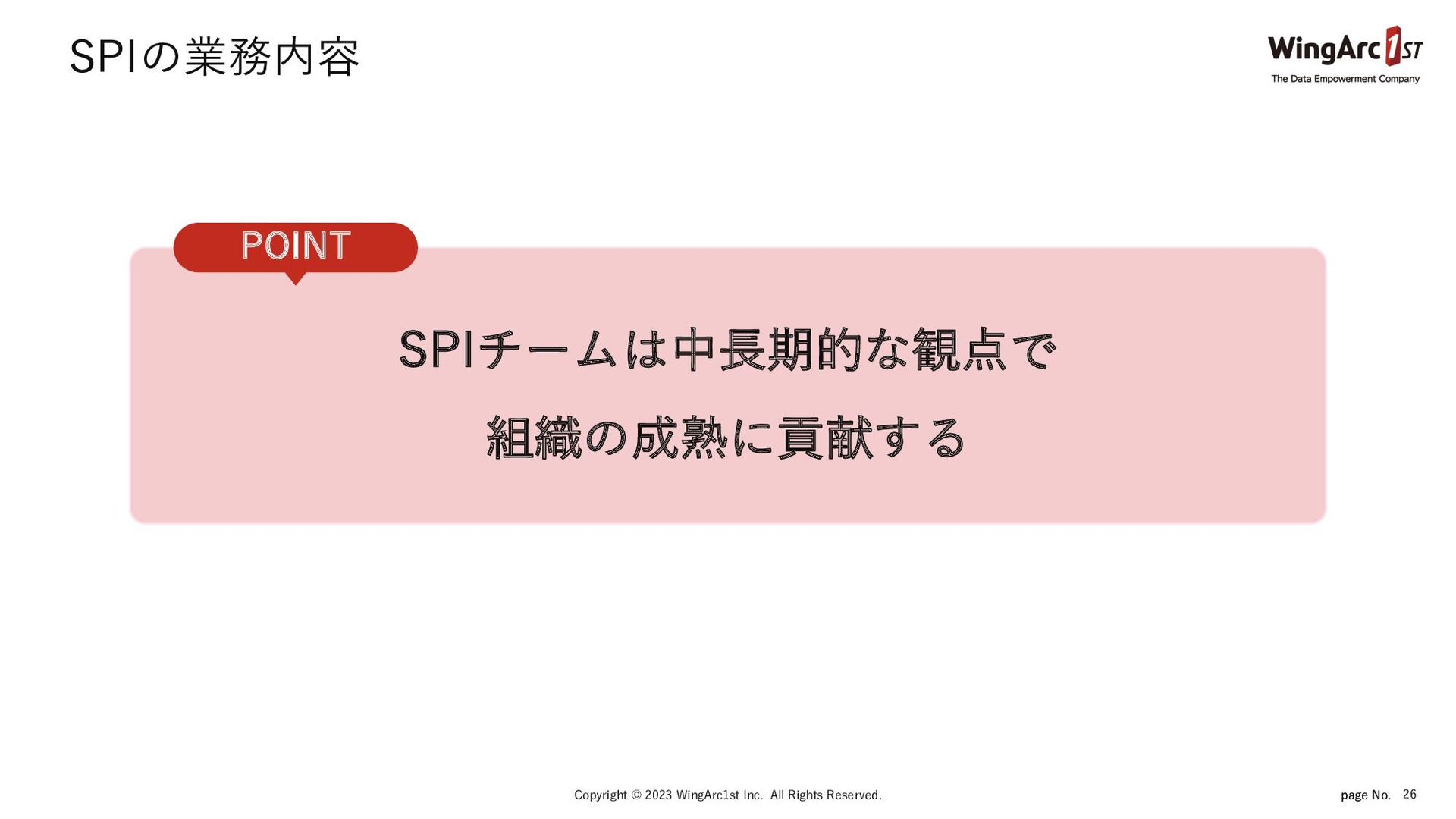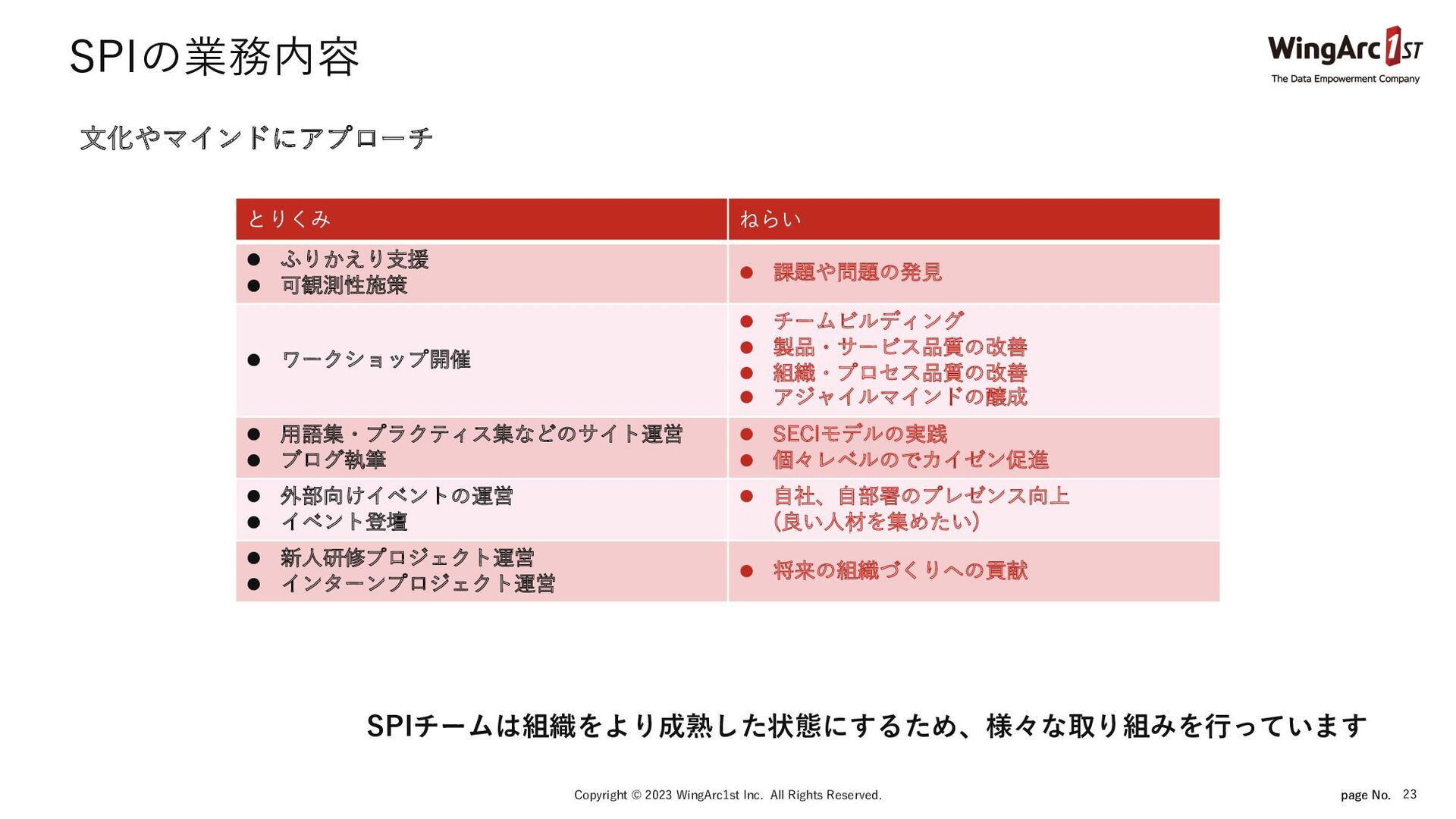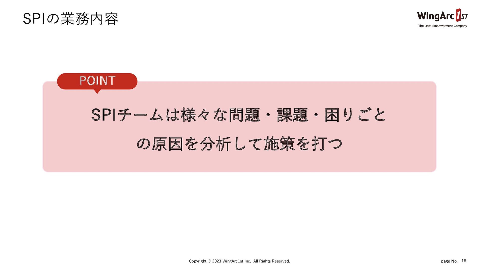 All Rights Reserved. SPIの業務内容 ⽂化やマインドにアプローチ SPIチームは組織をより成熟した状態にするため、様々な取り組みを⾏っています とりくみ ねらい l ふりかえり⽀援 l 可観測性施策 l 課題や問題の発⾒ l ワークショップ開催 l チームビルディング l 製品・サービス品質の改善 l 組織・プロセス品質の改善 l アジャイルマインドの醸成 l ⽤語集・プラクティス集などのサイト運営 l ブログ執筆 l SECIモデルの実践 l 個々レベルのでカイゼン促進 l 外部向けイベントの運営 l イベント登壇 l ⾃社、⾃部署のプレゼンス向上 (良い⼈材を集めたい) l 新⼈研修プロジェクト運営 l インターンプロジェクト運営 l 将来の組織づくりへの貢献