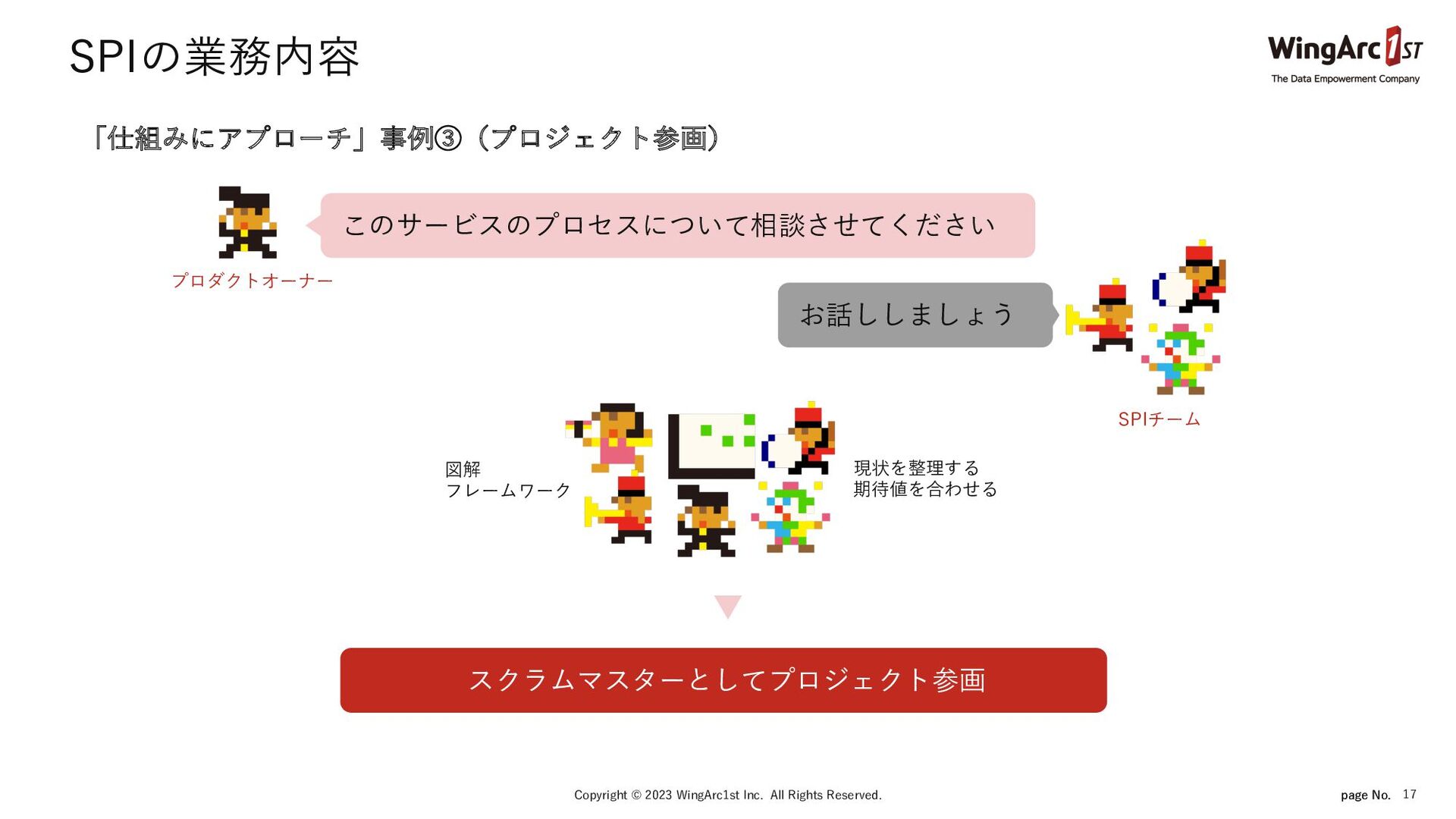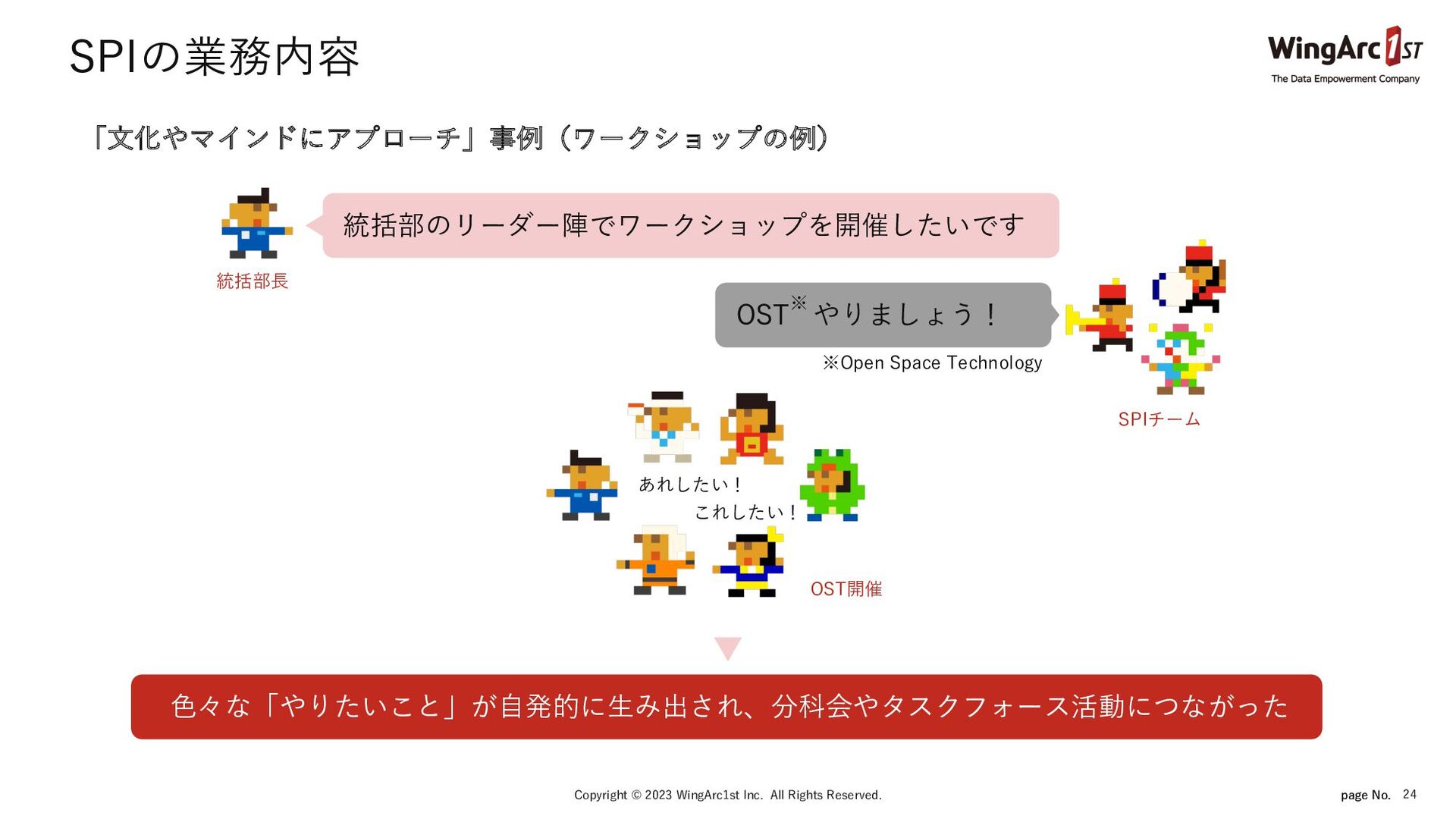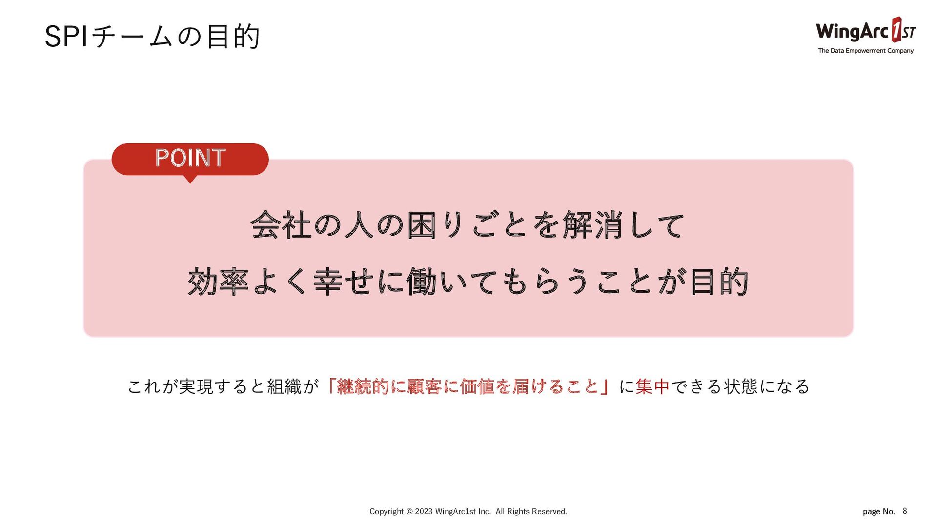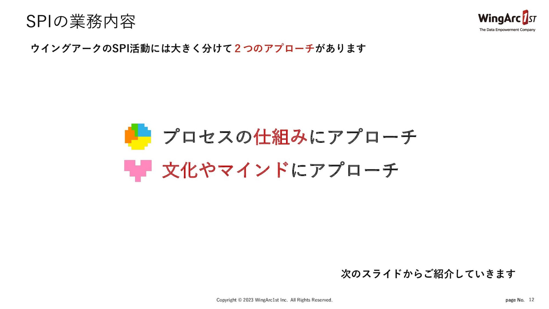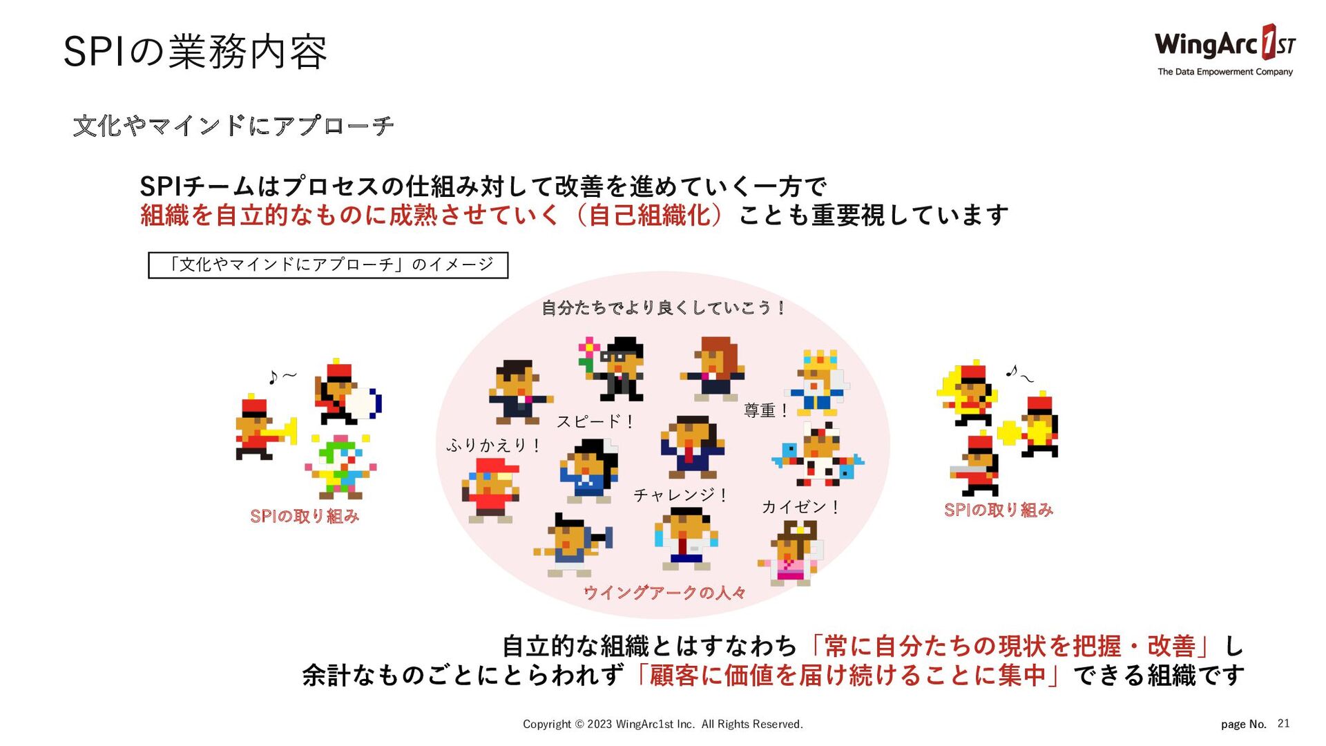 All Rights Reserved. SPIの業務内容 ⽂化やマインドにアプローチ SPIチームは組織をより成熟した状態にするため、様々な取り組みを⾏っています とりくみ ねらい l ふりかえり⽀援 l 可観測性施策 l 課題や問題の発⾒ l ワークショップ開催 l チームビルディング l 製品・サービス品質の改善 l 組織・プロセス品質の改善 l アジャイルマインドの醸成 l ⽤語集・プラクティス集などのサイト運営 l ブログ執筆 l SECIモデルの実践 l 個々レベルのでカイゼン促進 l 外部向けイベントの運営 l イベント登壇 l ⾃社、⾃部署のプレゼンス向上 (良い⼈材を集めたい) l 新⼈研修プロジェクト運営 l インターンプロジェクト運営 l 将来の組織づくりへの貢献