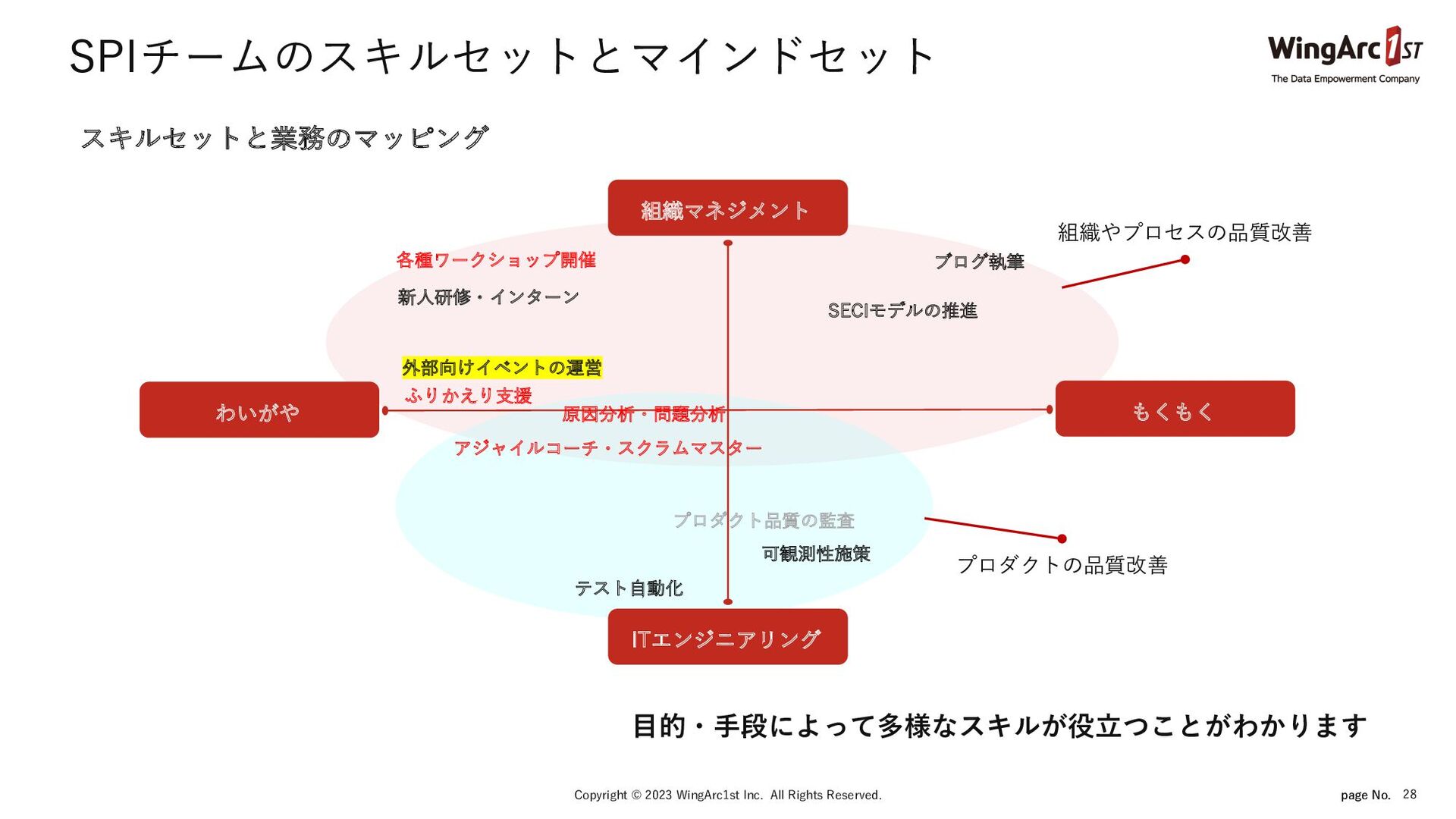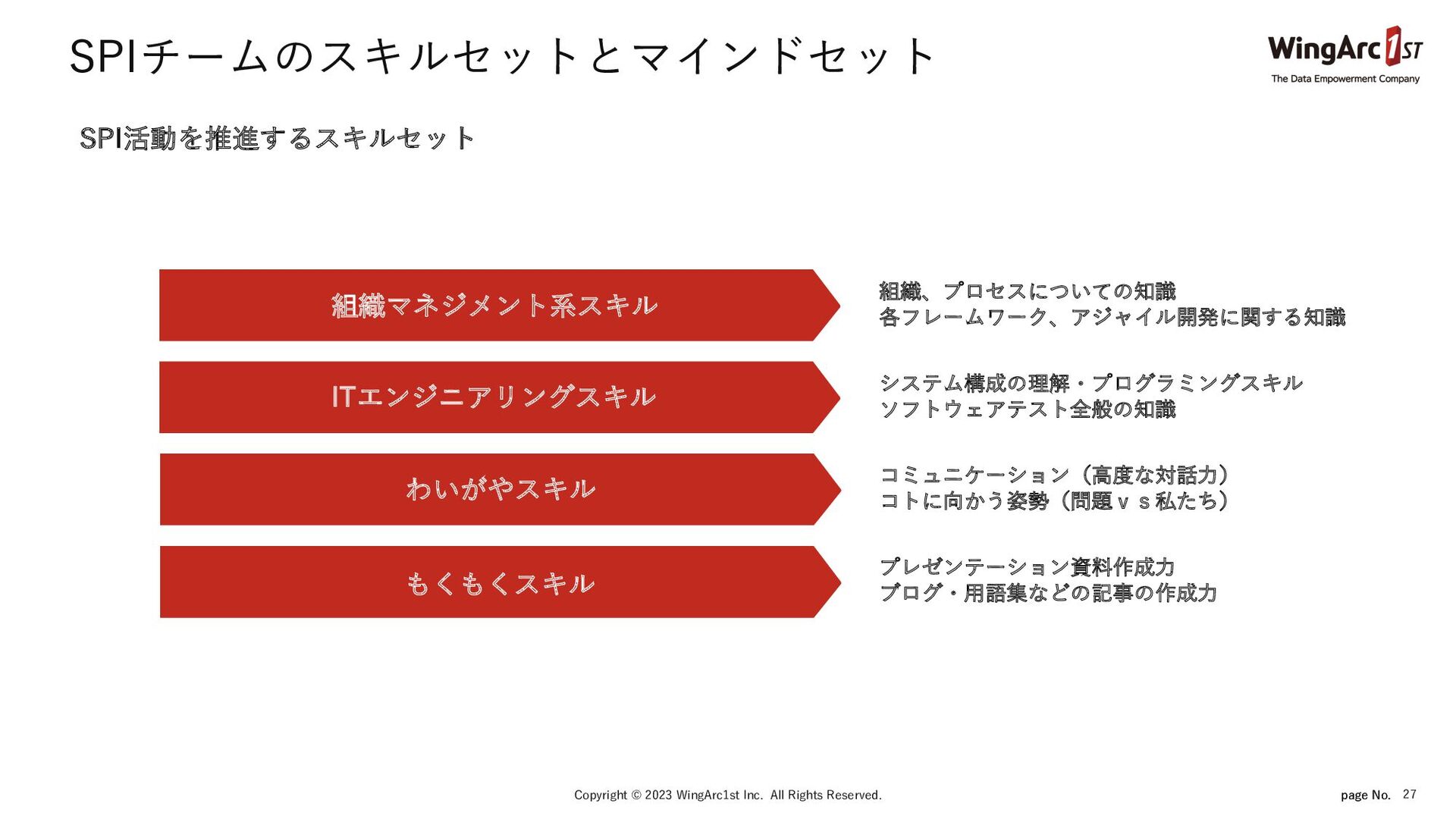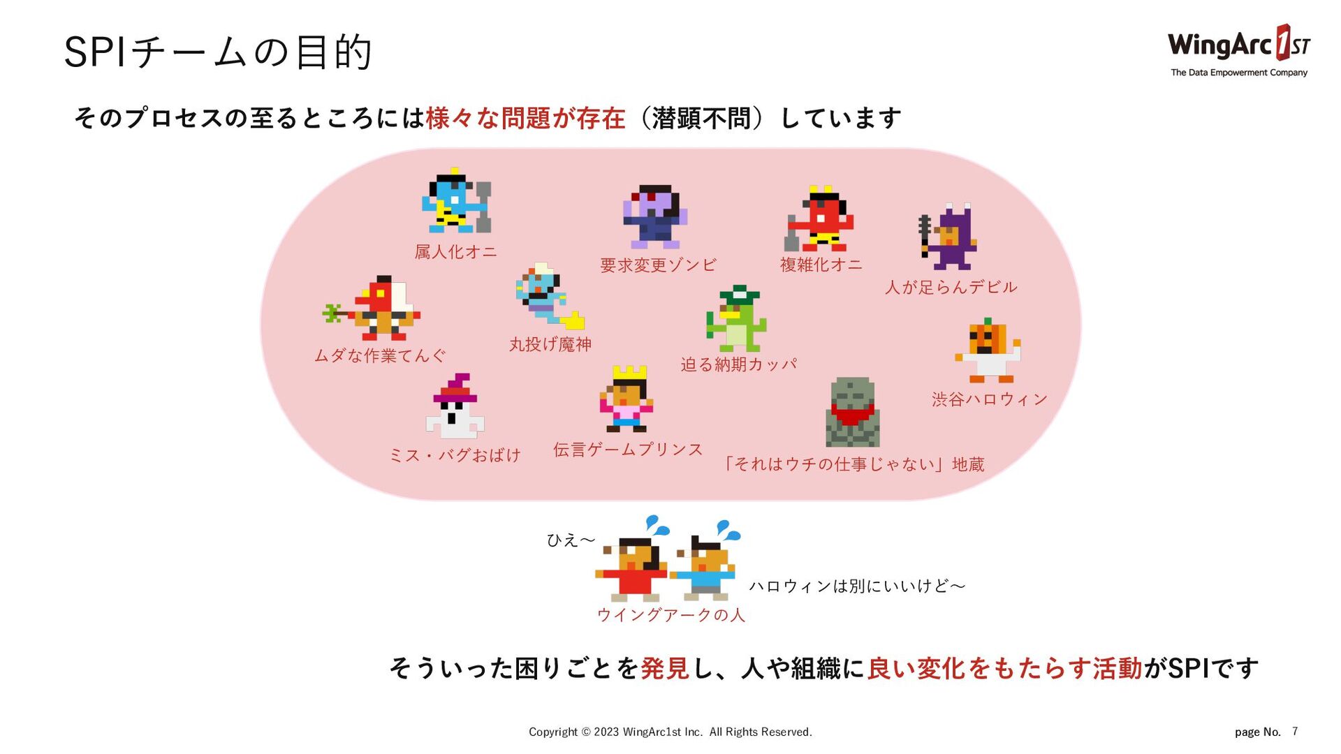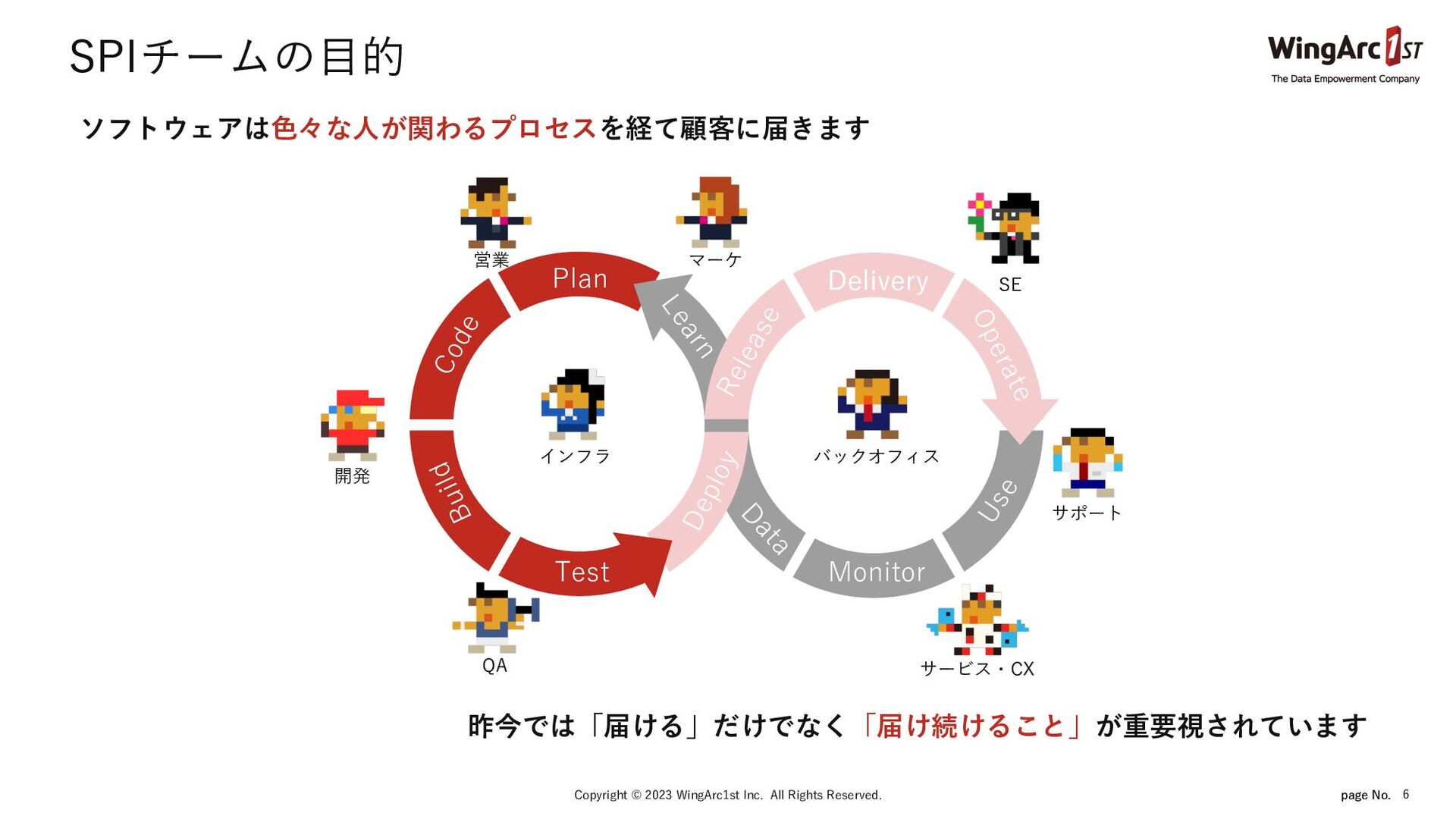 All Rights Reserved. SPIの業務内容 ⽂化やマインドにアプローチ SPIチームは組織をより成熟した状態にするため、様々な取り組みを⾏っています とりくみ ねらい l ふりかえり⽀援 l 可観測性施策 l 課題や問題の発⾒ l ワークショップ開催 l チームビルディング l 製品・サービス品質の改善 l 組織・プロセス品質の改善 l アジャイルマインドの醸成 l ⽤語集・プラクティス集などのサイト運営 l ブログ執筆 l SECIモデルの実践 l 個々レベルのでカイゼン促進 l 外部向けイベントの運営 l イベント登壇 l ⾃社、⾃部署のプレゼンス向上 (良い⼈材を集めたい) l 新⼈研修プロジェクト運営 l インターンプロジェクト運営 l 将来の組織づくりへの貢献