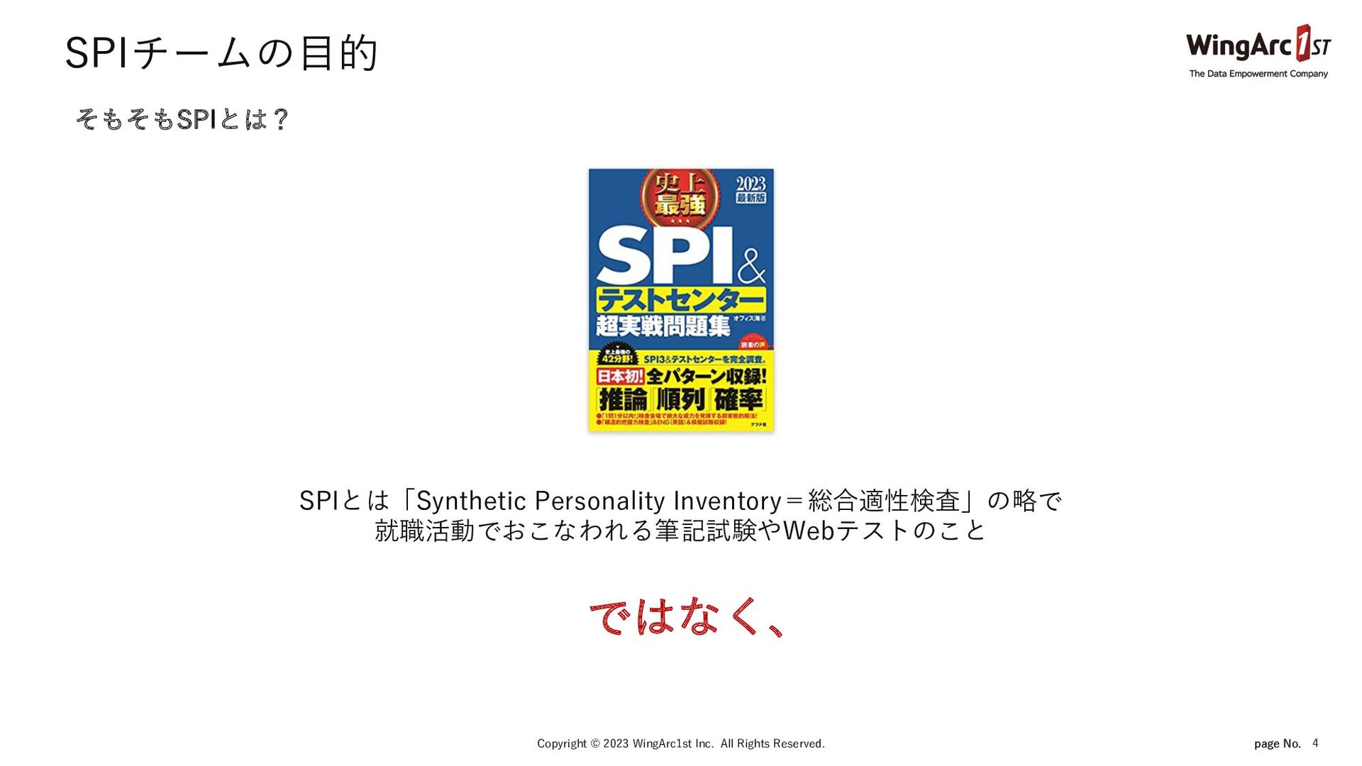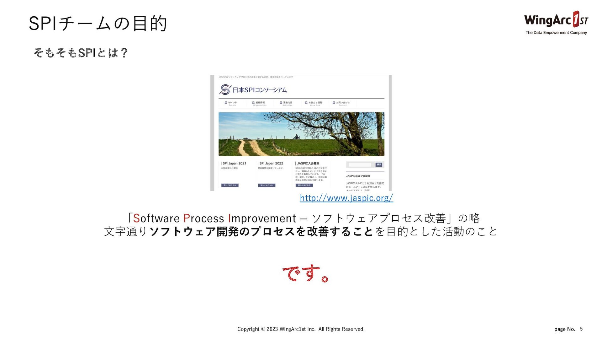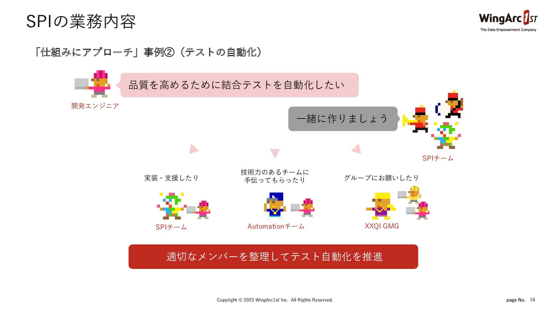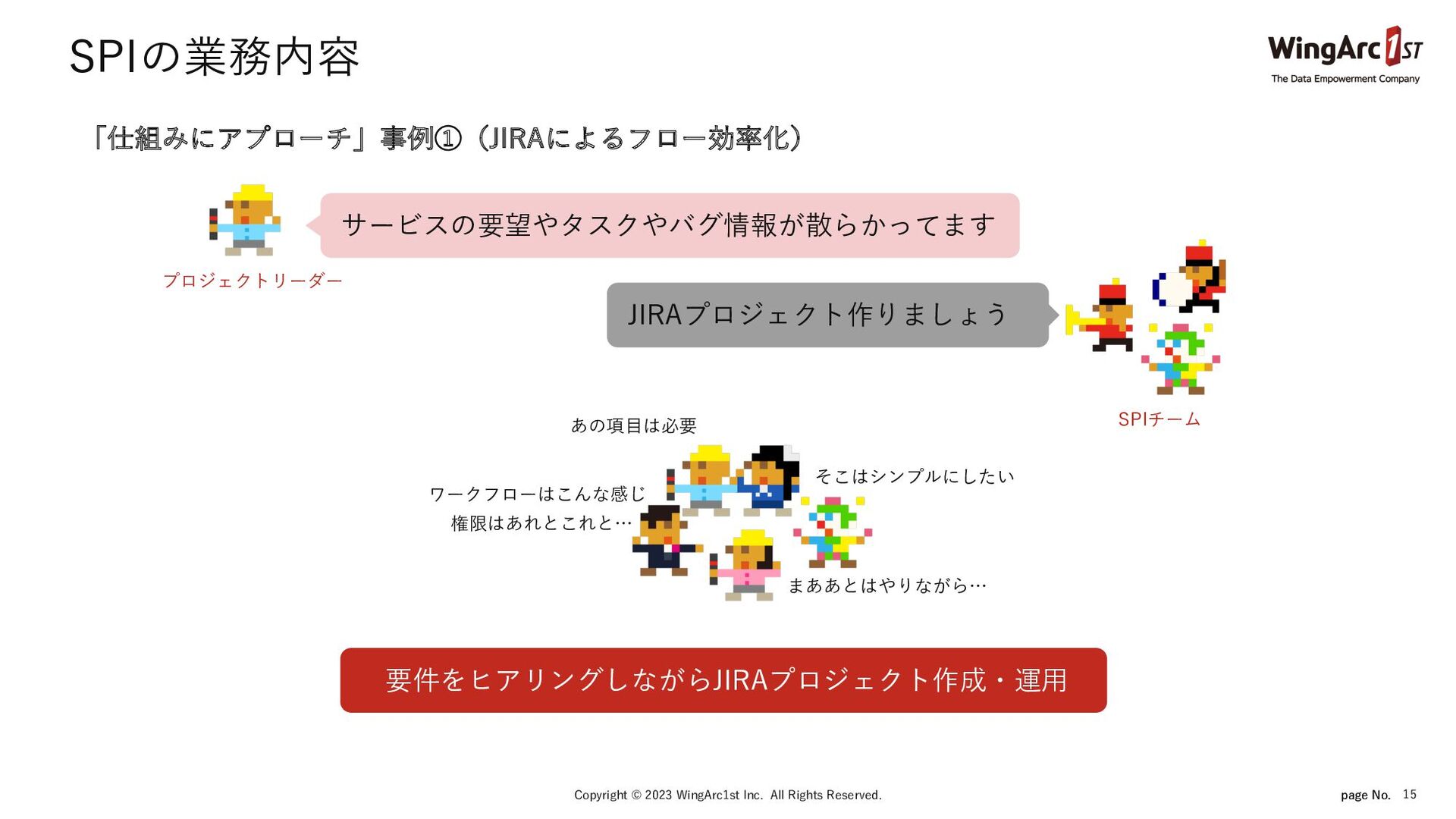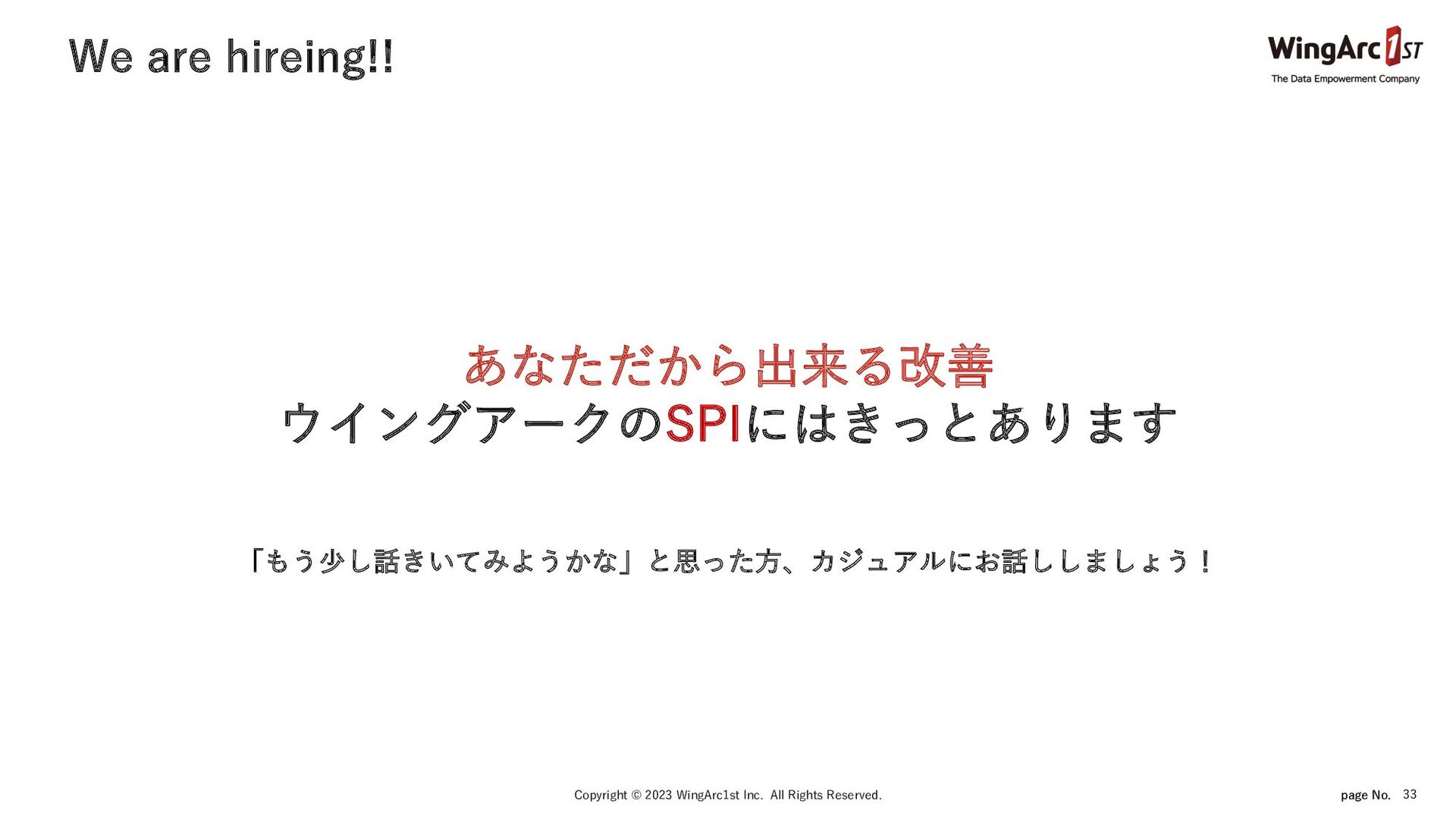 All Rights Reserved. SPIの業務内容 ⽂化やマインドにアプローチ SPIチームは組織をより成熟した状態にするため、様々な取り組みを⾏っています とりくみ ねらい l ふりかえり⽀援 l 可観測性施策 l 課題や問題の発⾒ l ワークショップ開催 l チームビルディング l 製品・サービス品質の改善 l 組織・プロセス品質の改善 l アジャイルマインドの醸成 l ⽤語集・プラクティス集などのサイト運営 l ブログ執筆 l SECIモデルの実践 l 個々レベルのでカイゼン促進 l 外部向けイベントの運営 l イベント登壇 l ⾃社、⾃部署のプレゼンス向上 (良い⼈材を集めたい) l 新⼈研修プロジェクト運営 l インターンプロジェクト運営 l 将来の組織づくりへの貢献