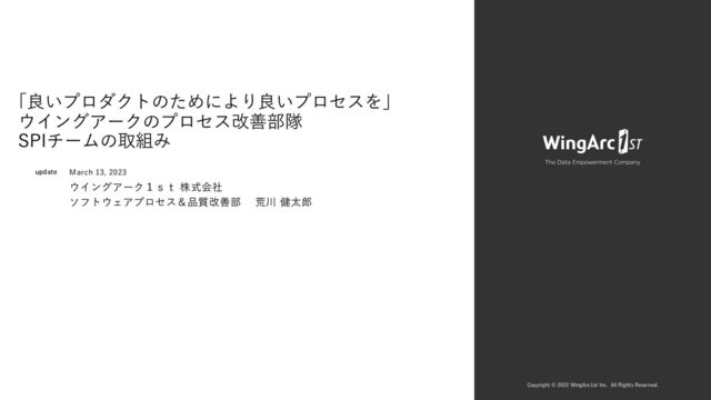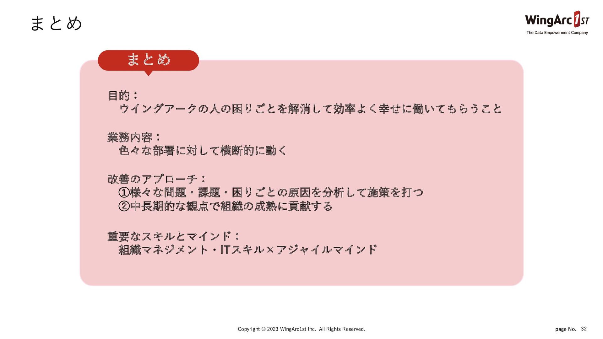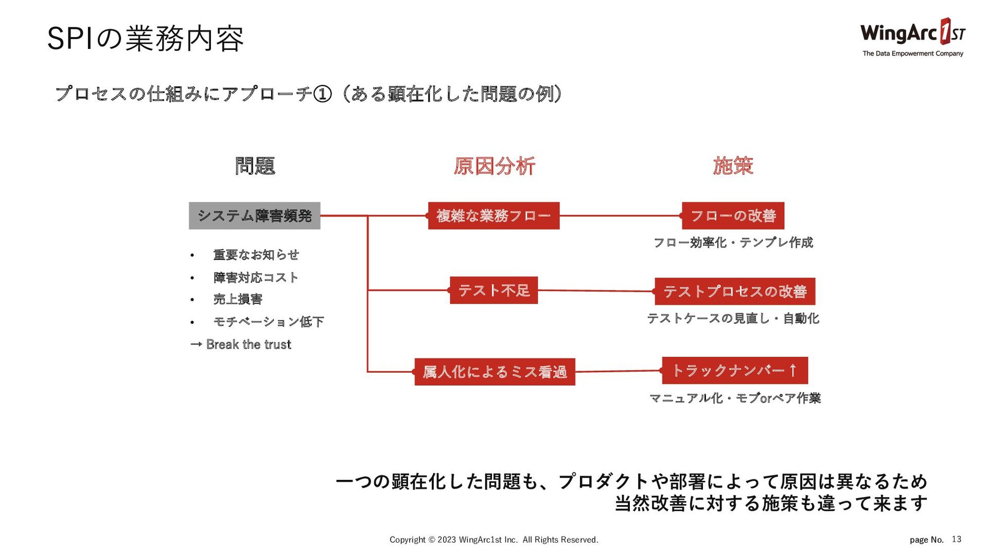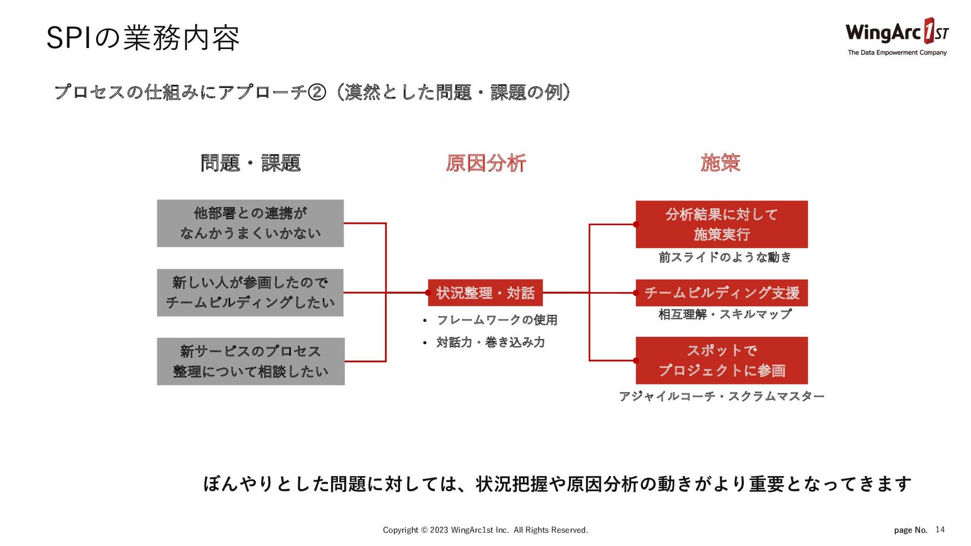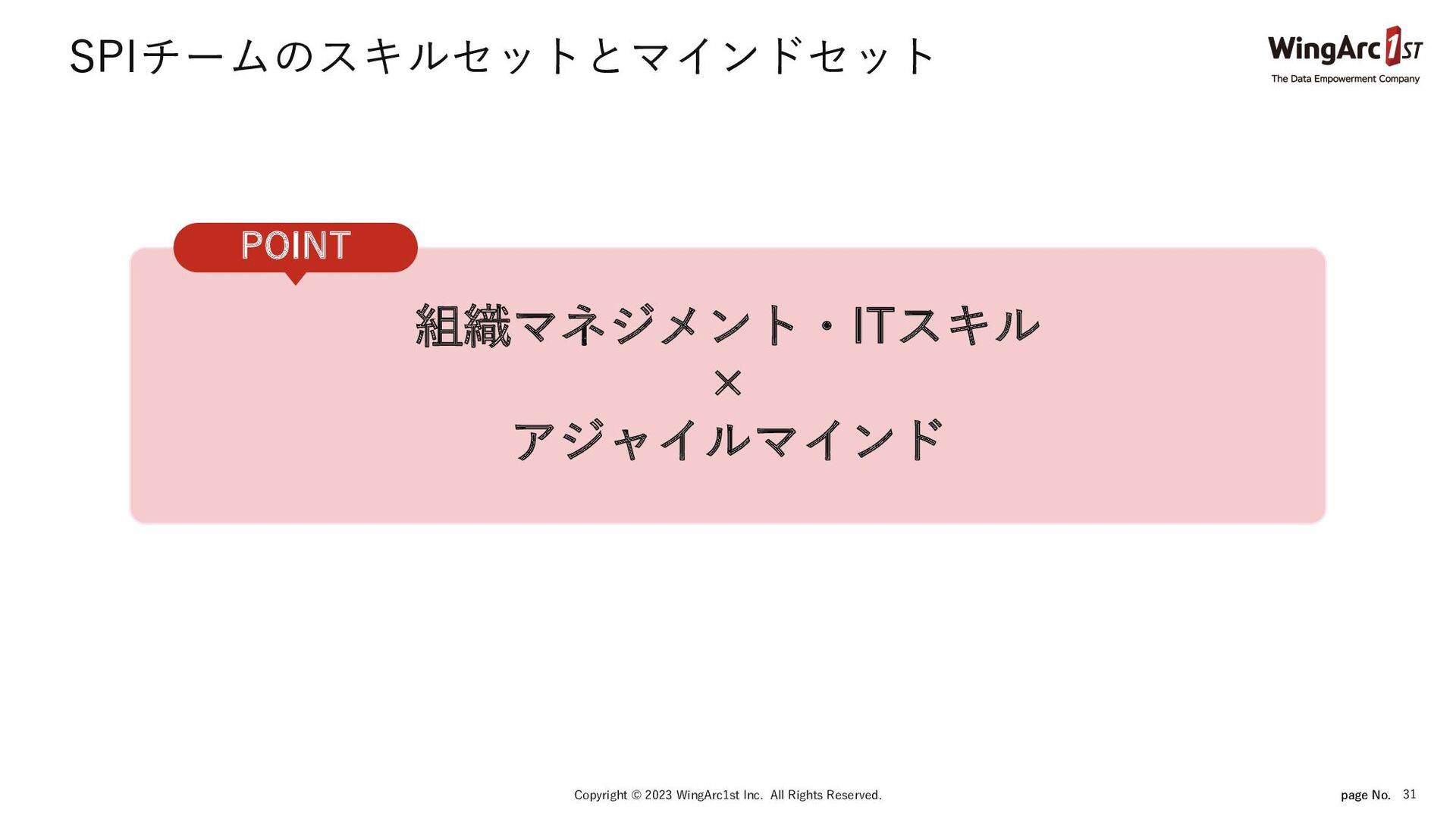 All Rights Reserved. SPIの業務内容 ⽂化やマインドにアプローチ SPIチームは組織をより成熟した状態にするため、様々な取り組みを⾏っています とりくみ ねらい l ふりかえり⽀援 l 可観測性施策 l 課題や問題の発⾒ l ワークショップ開催 l チームビルディング l 製品・サービス品質の改善 l 組織・プロセス品質の改善 l アジャイルマインドの醸成 l ⽤語集・プラクティス集などのサイト運営 l ブログ執筆 l SECIモデルの実践 l 個々レベルのでカイゼン促進 l 外部向けイベントの運営 l イベント登壇 l ⾃社、⾃部署のプレゼンス向上 (良い⼈材を集めたい) l 新⼈研修プロジェクト運営 l インターンプロジェクト運営 l 将来の組織づくりへの貢献