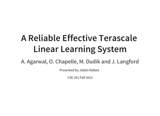 “A Reliable Effective Terascale Linear Learning System,” J. Mach. Learn. Res., vol. 15, no. 1, pp. 1111–1133, Jan. 2014. [2]M. Zinkevich, M. Weimer, L. Li, and A. J. Smola, “Parallelized stochastic gradient descent,” in Advances in neural information processing systems, 2010, pp. 2595–2603. [3]K. Weinberger, A. Dasgupta, J. Langford, A. Smola, and J. Attenberg, “Feature Hashing for Large Scale Multitask Learning,” in Proceedings of the 26th Annual International Conference on Machine Learning, New York, NY, USA, 2009, pp. 1113–1120. [4]O. Dekel, R. Gilad-Bachrach, O. Shamir, and L. Xiao, “Optimal distributed online prediction using mini-batches,” The Journal of Machine Learning Research, vol. 13, no. 1, pp. 165–202, 2012.