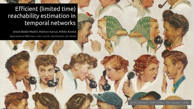 Badie-Modiri, A., Karsai, M., & Kivelä, M. (2020). Efficient limited-time reachability estimation in temporal networks. Physical Review E, 101(5), 052303.