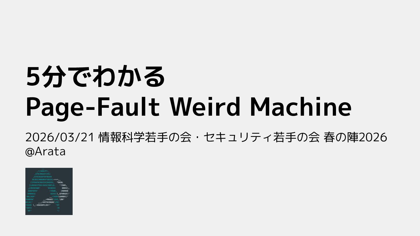 5分でわかる Page-Fault Weird Machine 2026/03/21 情報科学若手の会・セキュリティ若手の会 春の陣2026 @Arata