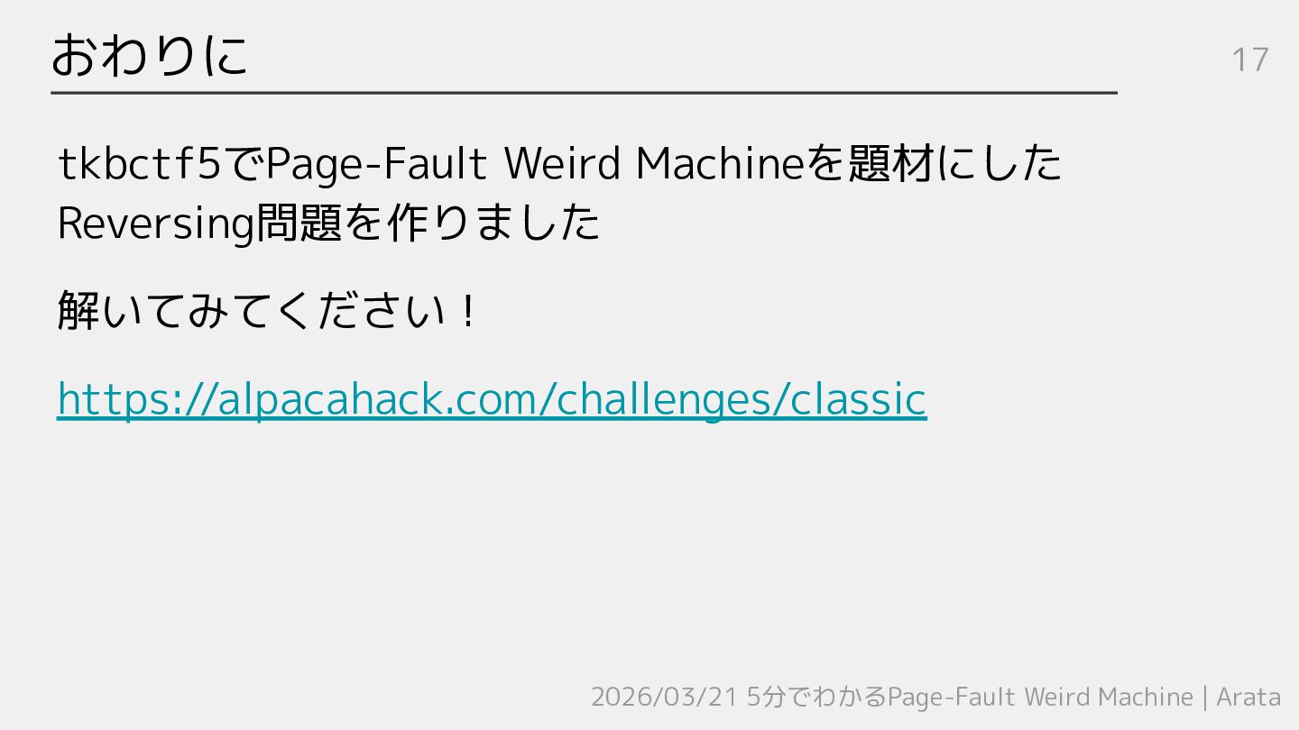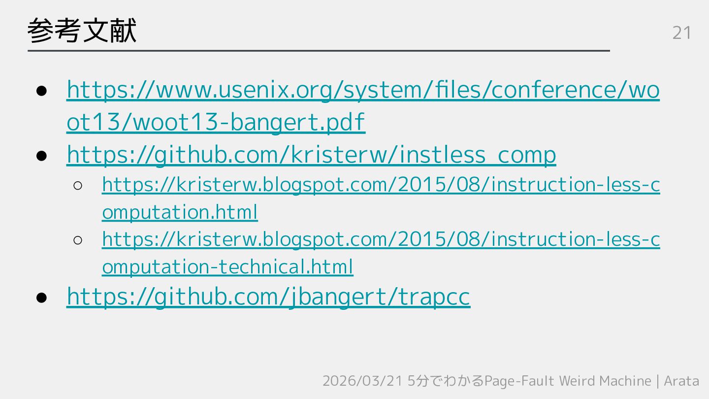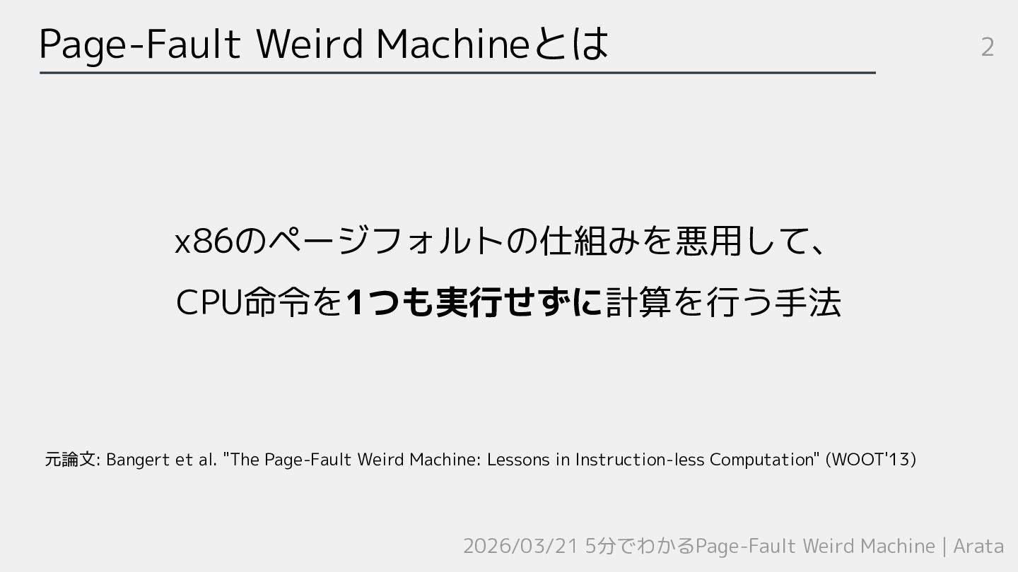 2026/03/21 5分でわかるPage-Fault Weird Machine | Arata • https://www.usenix.org/system/files/conference/wo ot13/woot13-bangert.pdf •