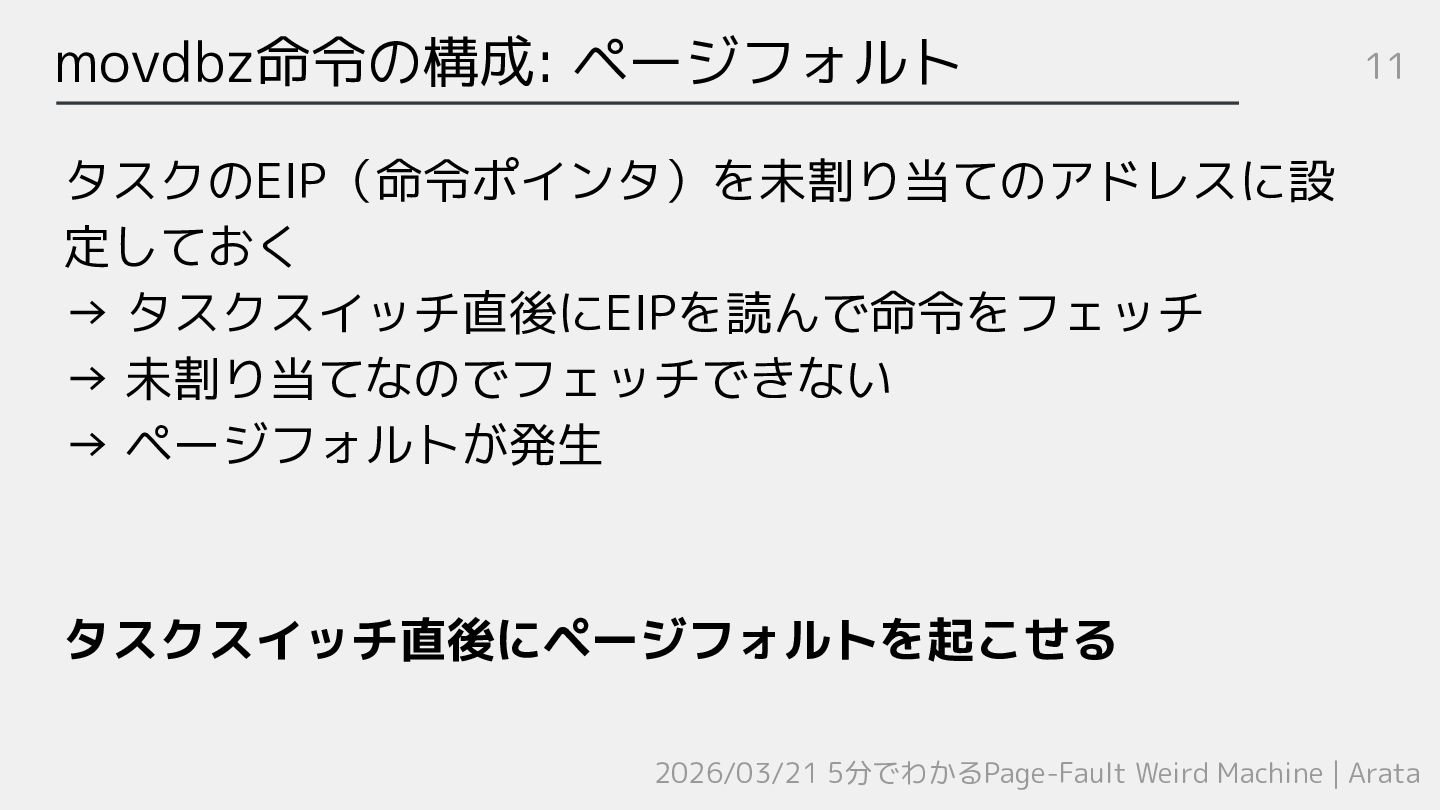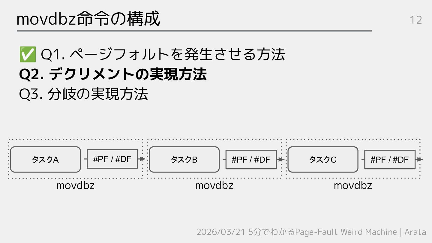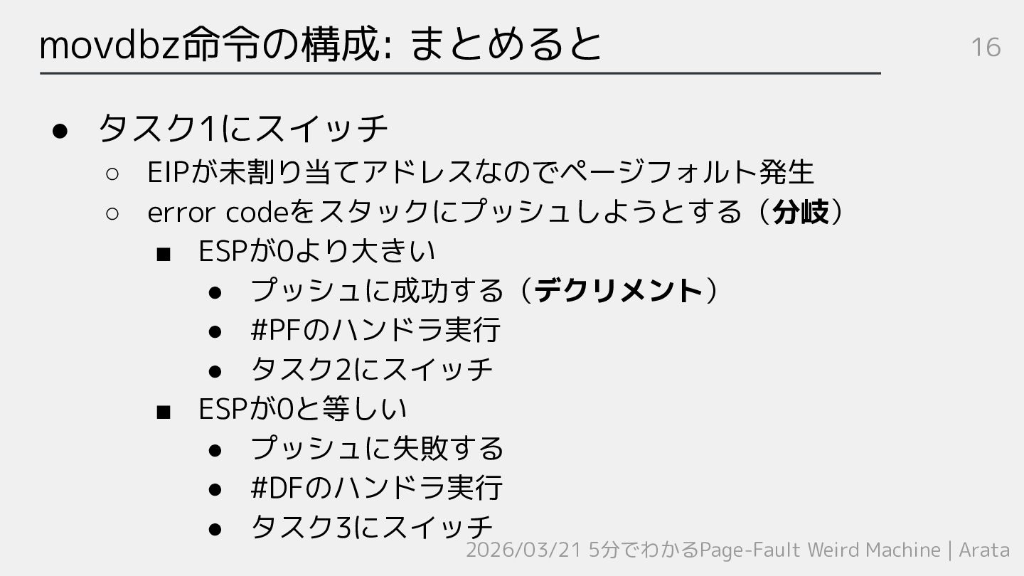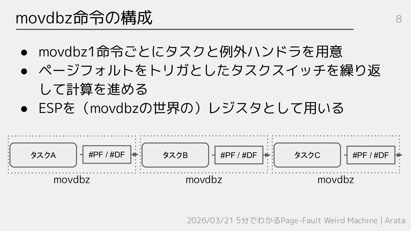 2026/03/21 5分でわかるPage-Fault Weird Machine | Arata • movdbz1命令ごとにタスクと例外ハンドラを用意 • ページフォルトをトリガとしたタスクスイッチを繰り返