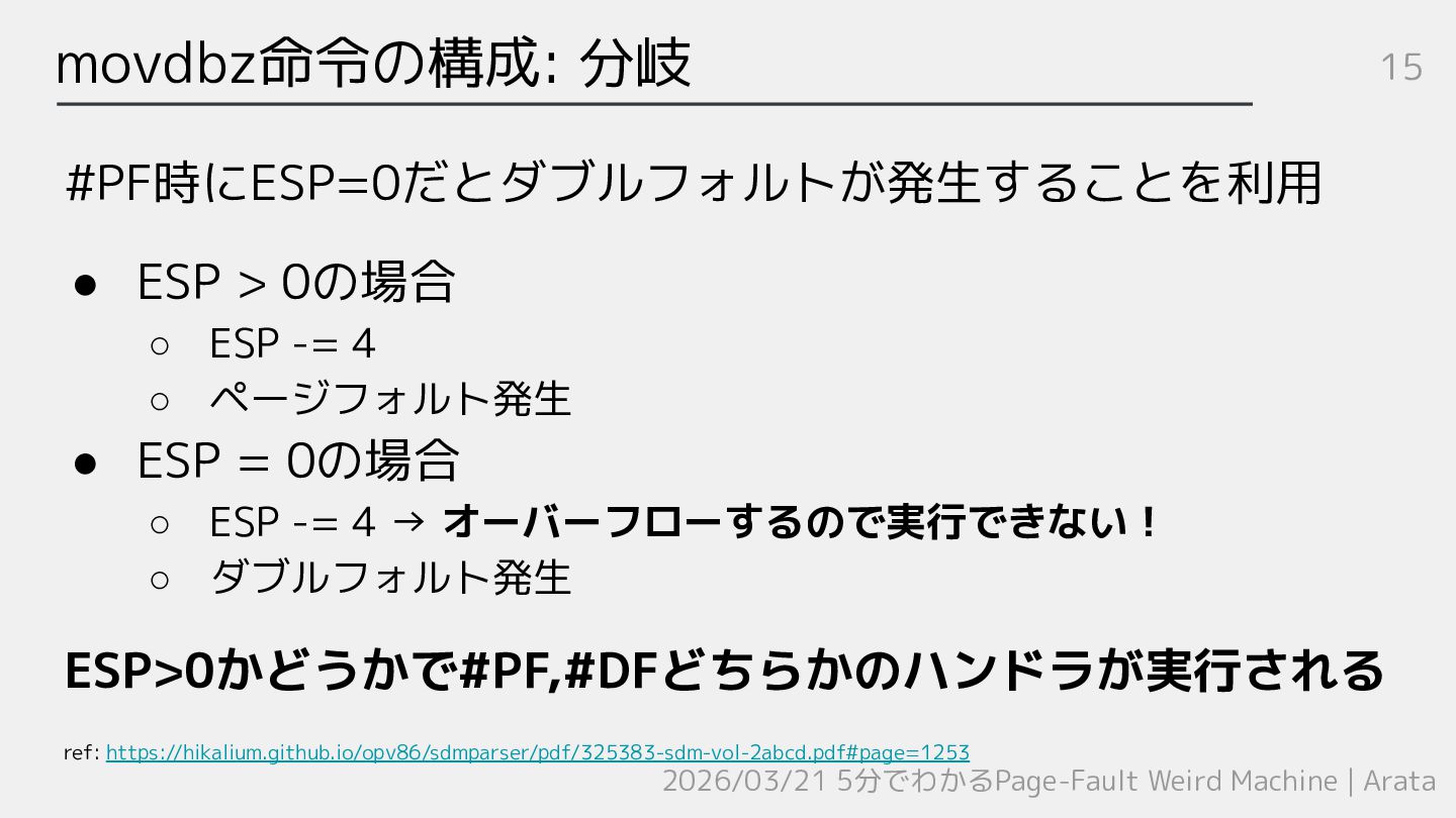2026/03/21 5分でわかるPage-Fault Weird Machine | Arata #PF時にESP=0だとダブルフォルトが発生することを利用 • ESP >