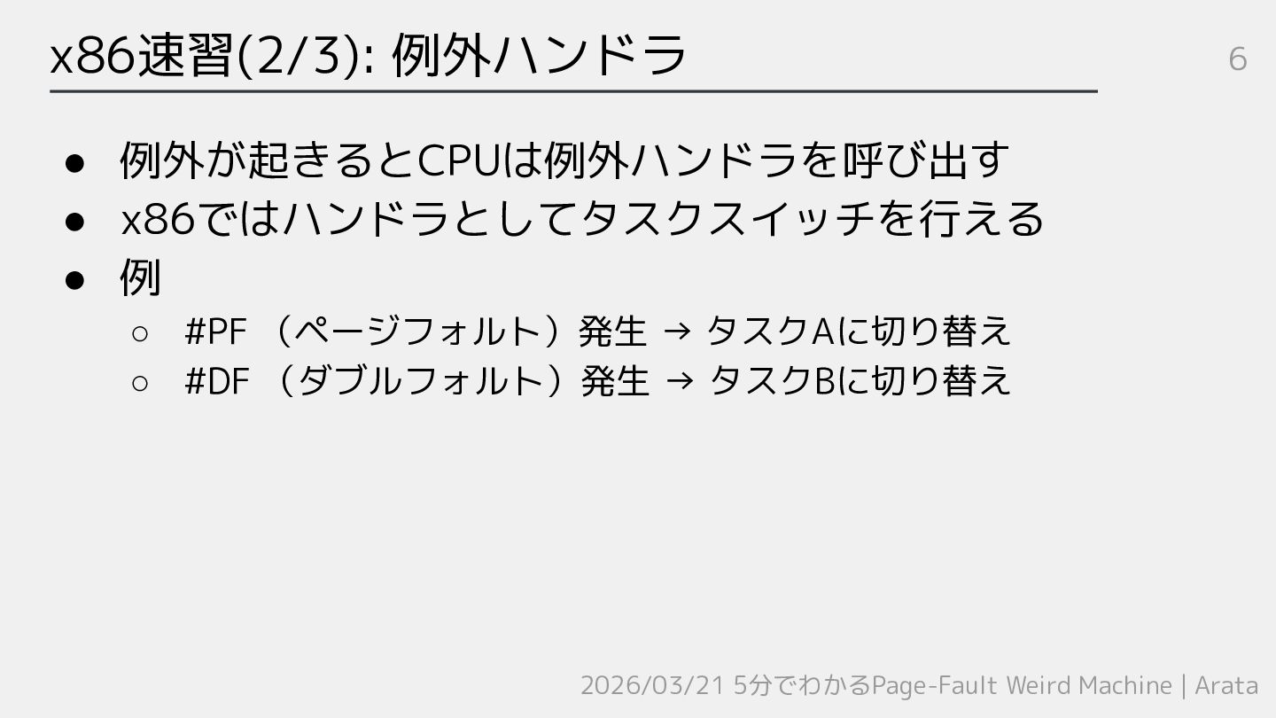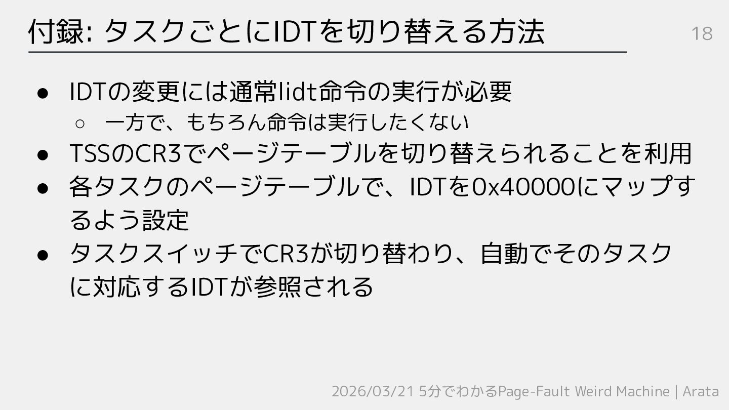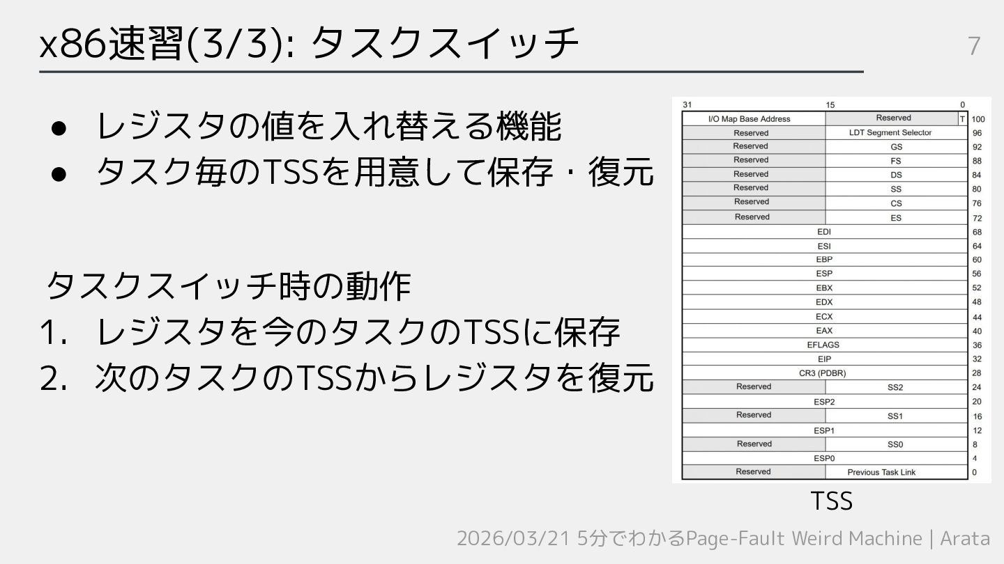 2026/03/21 5分でわかるPage-Fault Weird Machine | Arata • レジスタの値を入れ替える機能 • タスク毎のTSSを用意して保存・復元