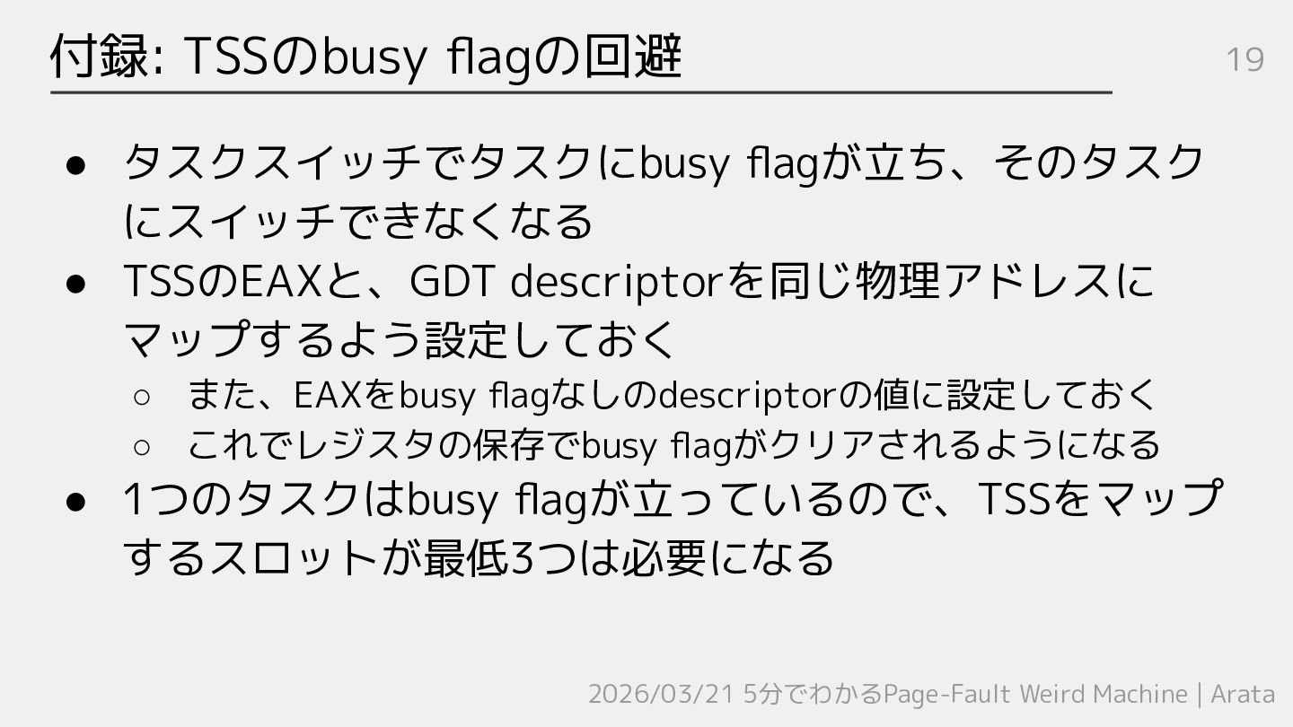 2026/03/21 5分でわかるPage-Fault Weird Machine | Arata • タスクスイッチでタスクにbusy flagが立ち、そのタスク にスイッチできなくなる