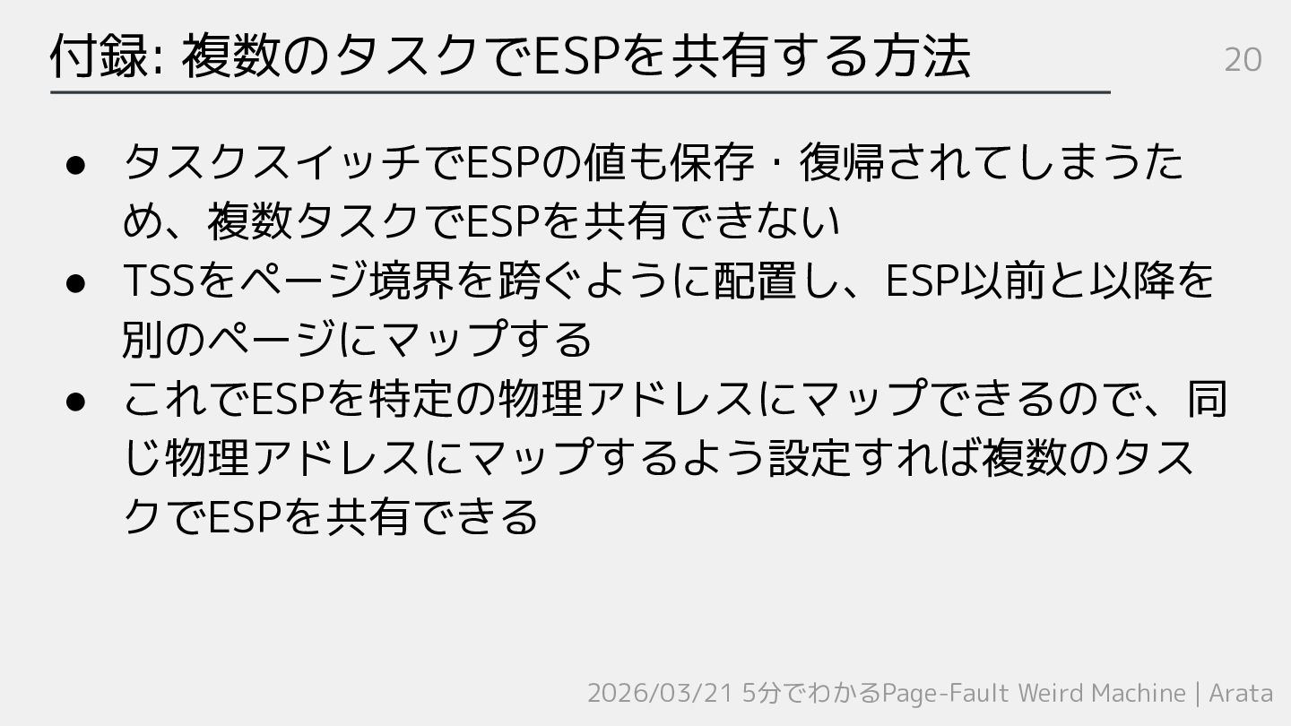 2026/03/21 5分でわかるPage-Fault Weird Machine | Arata • タスクスイッチでESPの値も保存・復帰されてしまうた め、複数タスクでESPを共有できない •