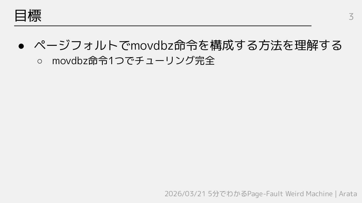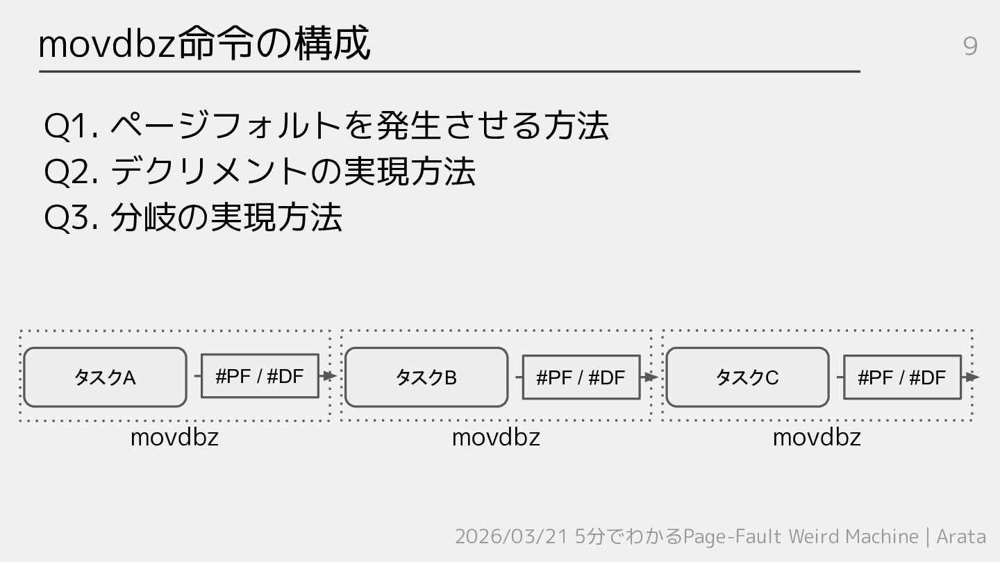 2026/03/21 5分でわかるPage-Fault Weird Machine | Arata • ページフォルトでmovdbz命令を構成する方法を理解する ◦ movdbz命令1つでチューリング完全