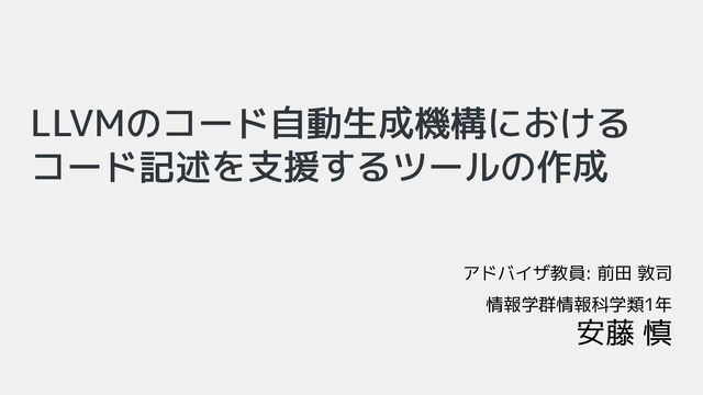 LLVMのコード自動生成機構における コード記述を支援するツールの作成 アドバイザ教員: 前田 敦司 情報学群情報科学類1年 安藤 慎