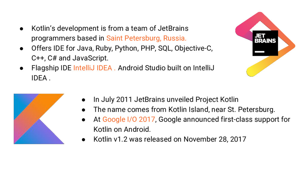 based in Saint Petersburg, Russia. • Offers IDE for Java, Ruby, Python, PHP, SQL, Objective-C, C++, C# and JavaScript. • Flagship IDE IntelliJ IDEA . Android Studio built on IntelliJ IDEA . • In July 2011 JetBrains unveiled Project Kotlin • The name comes from Kotlin Island, near St. Petersburg. • At Google I/O 2017, Google announced first-class support for Kotlin on Android. • Kotlin v1.2 was released on November 28, 2017
