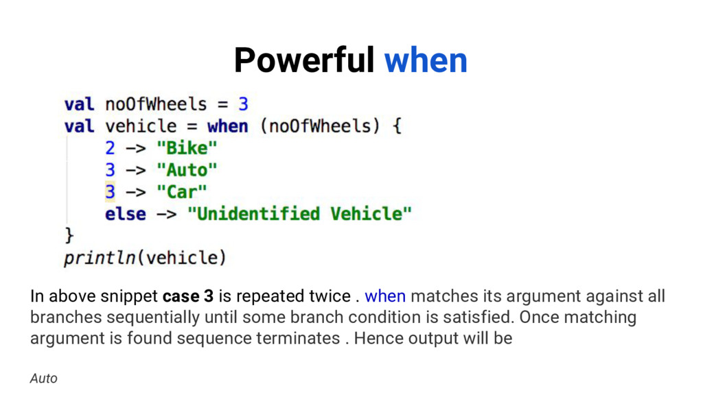 . when matches its argument against all branches sequentially until some branch condition is satisfied. Once matching argument is found sequence terminates . Hence output will be Auto