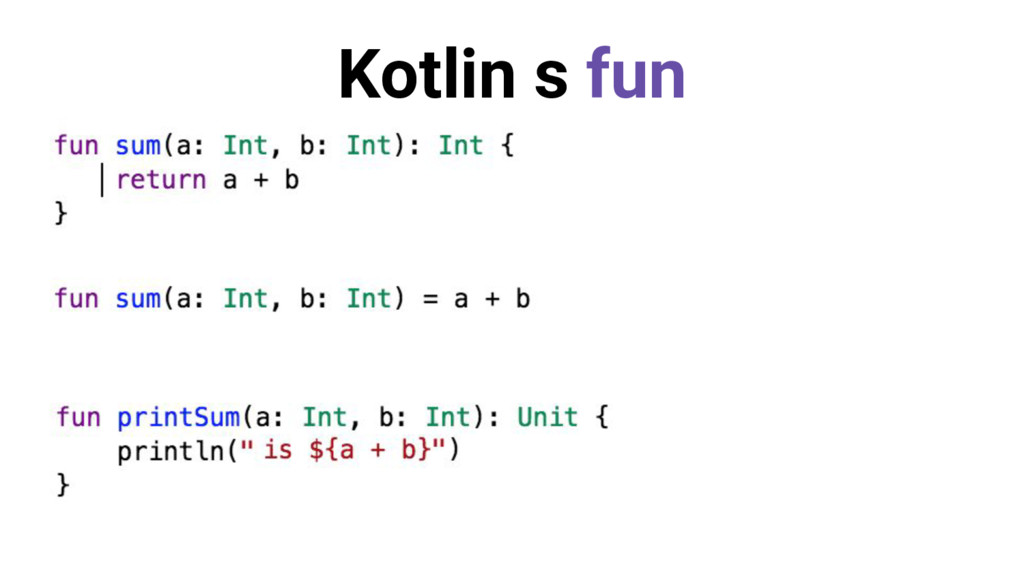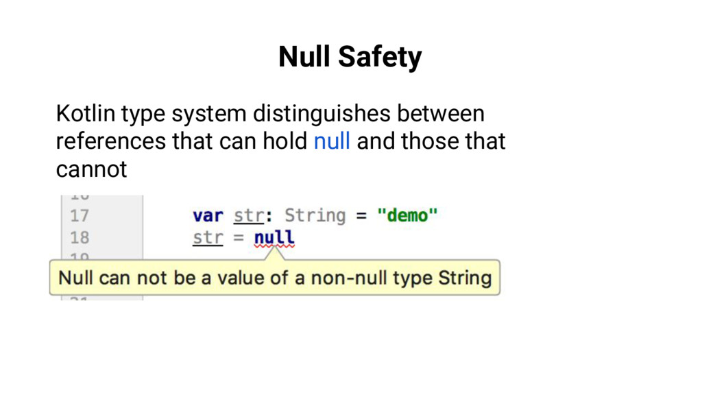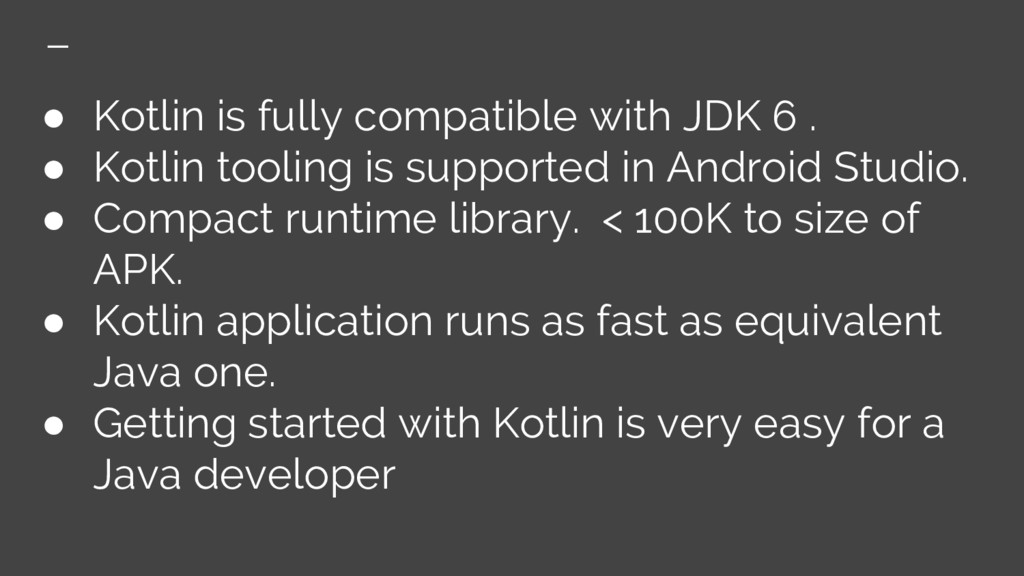 Kotlin tooling is supported in Android Studio. • Compact runtime library. < 100K to size of APK. • Kotlin application runs as fast as equivalent Java one. • Getting started with Kotlin is very easy for a Java developer