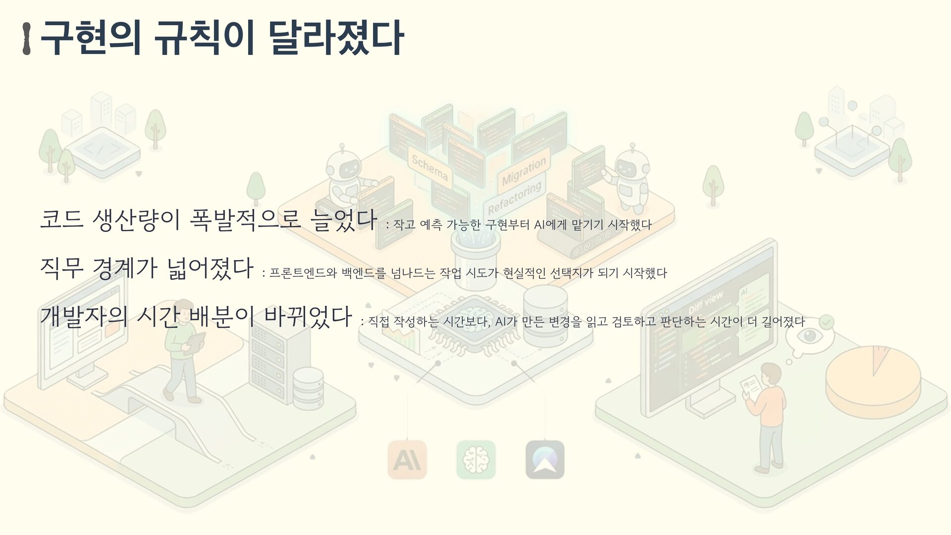 시간보다, AI가 만든 변경을 읽고 검토하고 판단하는 시간이 더 길어졌다 직무 경계가 넓어졌다 : 프론트엔드와 백엔드를 넘나드는 작업 시도가 현실적인 선택지가 되기 시작했다 코드 생산량이 폭발적으로 늘었다 : 작고 예측 가능한 구현부터 AI에게 맡기기 시작했다
