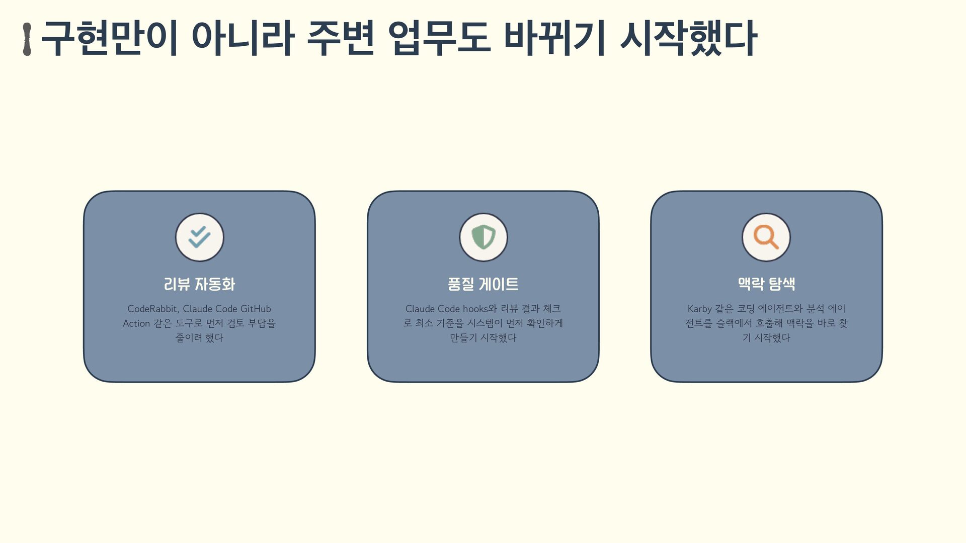 Claude Code GitHub Action 같은 도구로 먼저 검토 부담을 줄이려 했다 Claude Code hooks와 리뷰 결과 체크 로 최소 기준을 시스템이 먼저 확인하게 만들기 시작했다 Karby 같은 코딩 에이전트와 분석 에이 전트를 슬랙에서 호출해 맥락을 바로 찾 기 시작했다