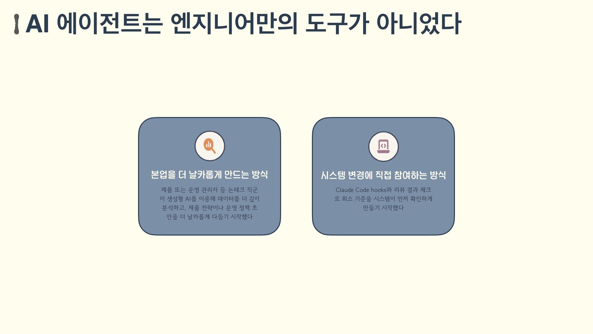 관리자 등 논테크 직군 이 생성형 AI를 이용해 데이터를 더 깊이 분석하고, 제품 전략이나 운영 정책 초 안을 더 날카롭게 다듬기 시작했다 Claude Code hooks와 리뷰 결과 체크 로 최소 기준을 시스템이 먼저 확인하게 만들기 시작했다