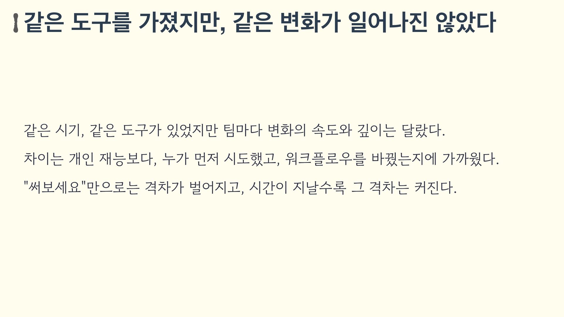 시간이 지날수록 그 격차는 커진다. 차이는 개인 재능보다, 누가 먼저 시도했고, 워크플로우를 바꿨는지에 가까웠다. 같은 시기, 같은 도구가 있었지만 팀마다 변화의 속도와 깊이는 달랐다.