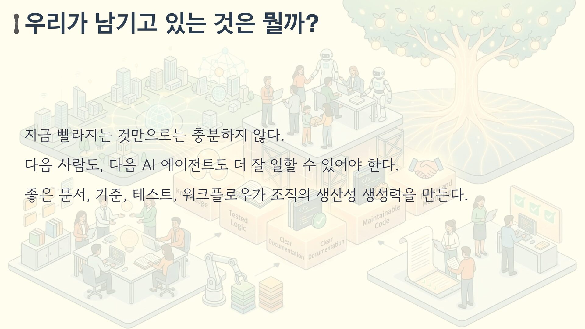 조직의 생산성 생성력을 만든다. 다음 사람도, 다음 AI 에이전트도 더 잘 일할 수 있어야 한다. 지금 빨라지는 것만으로는 충분하지 않다.