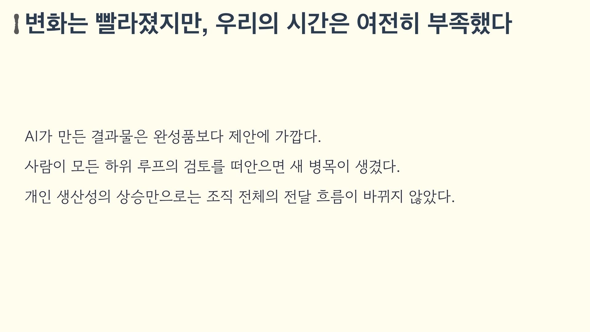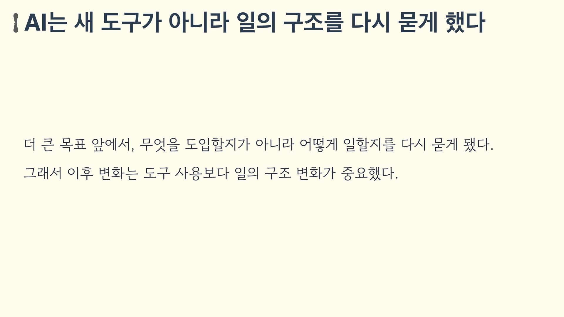 이후 변화는 도구 사용보다 일의 구조 변화가 중요했다. 더 큰 목표 앞에서, 무엇을 도입할지가 아니라 어떻게 일할지를 다시 묻게 됐다.