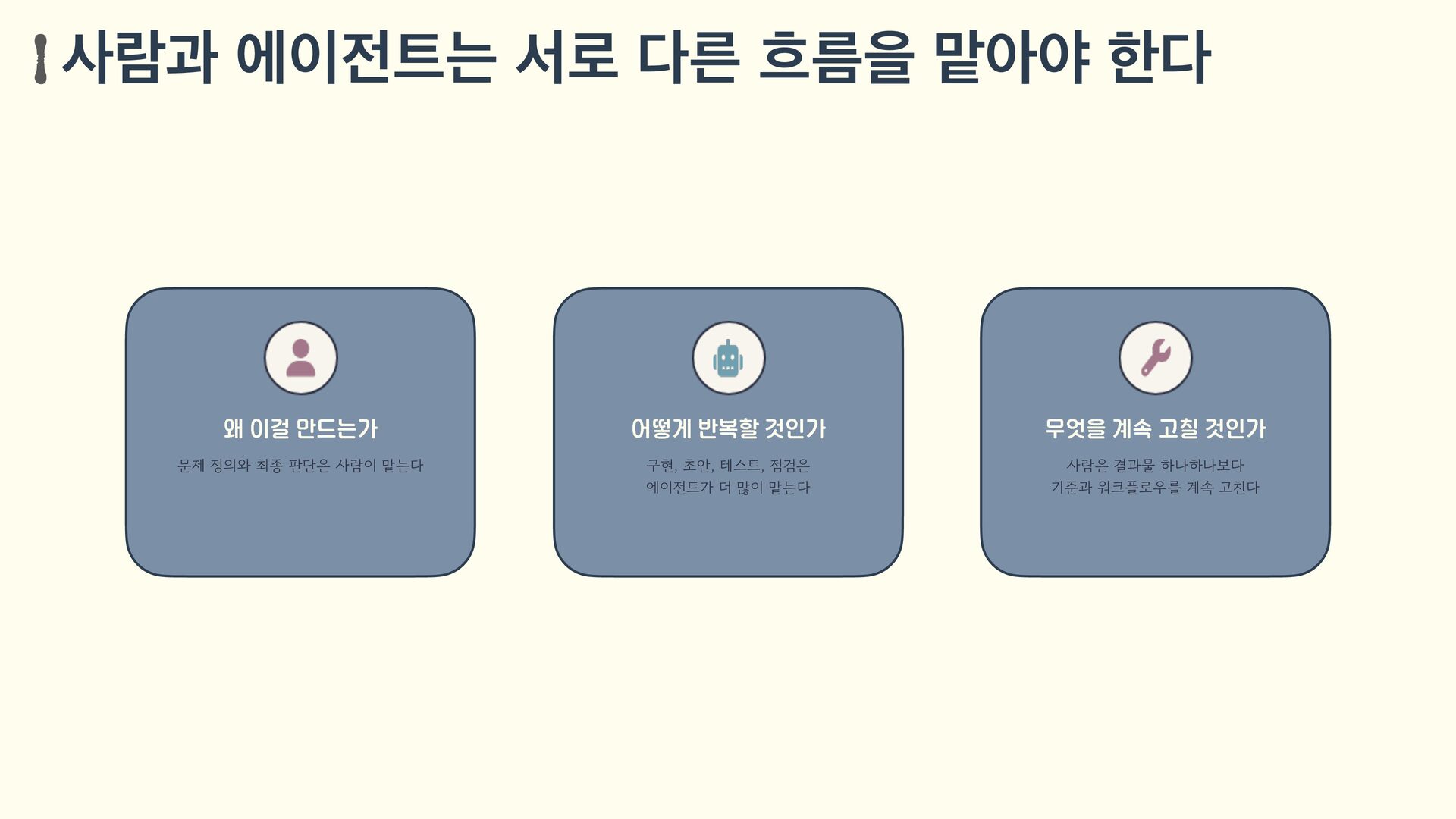 문제 정의와 최종 판단은 사람이 맡는다 구현, 초안, 테스트, 점검은 에이전트가 더 많이 맡는다 사람은 결과물 하나하나보다 기준과 워크플로우를 계속 고친다
