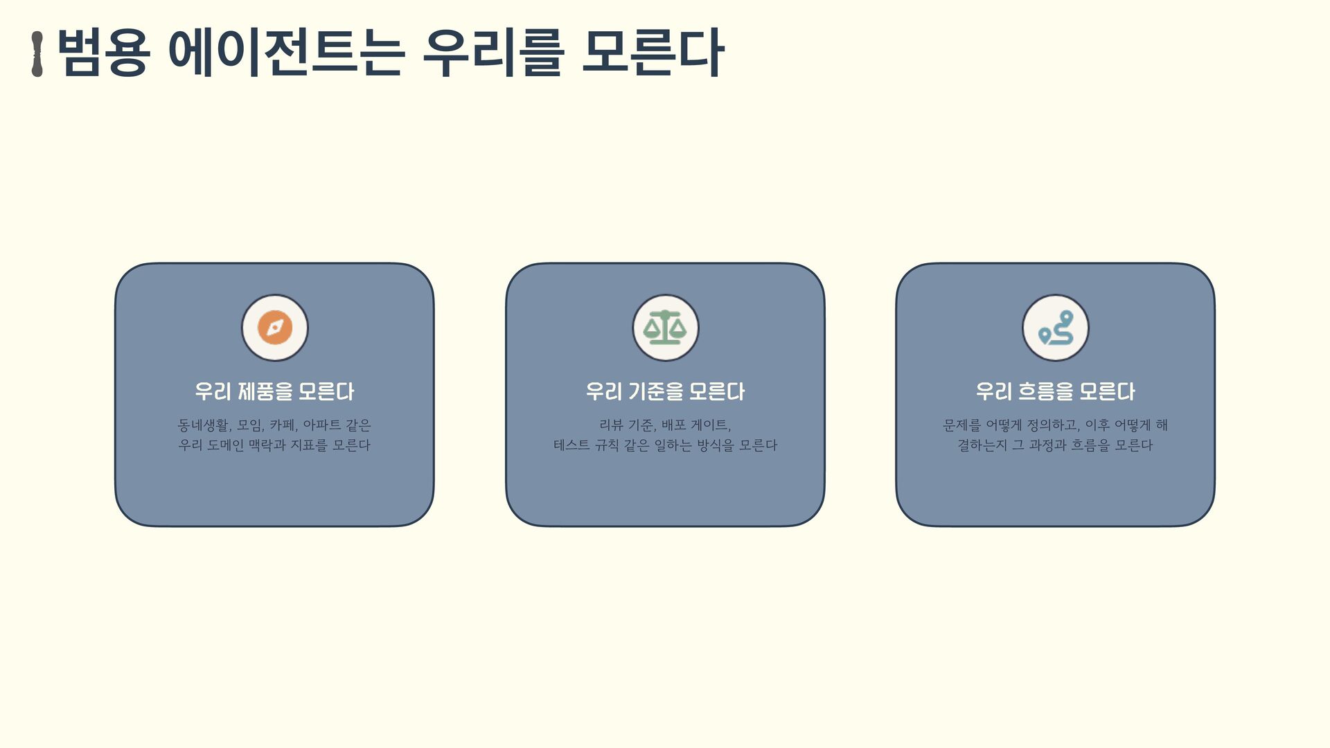 아파트 같은 우리 도메인 맥락과 지표를 모른다 리뷰 기준, 배포 게이트, 테스트 규칙 같은 일하는 방식을 모른다 문제를 어떻게 정의하고, 이후 어떻게 해 결하는지 그 과정과 흐름을 모른다