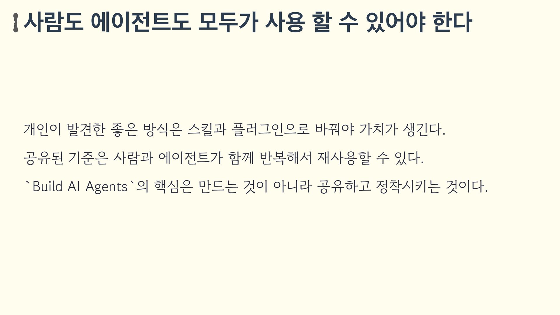 Agents`의 핵심은 만드는 것이 아니라 공유하고 정착시키는 것이다. 공유된 기준은 사람과 에이전트가 함께 반복해서 재사용할 수 있다. 개인이 발견한 좋은 방식은 스킬과 플러그인으로 바꿔야 가치가 생긴다.