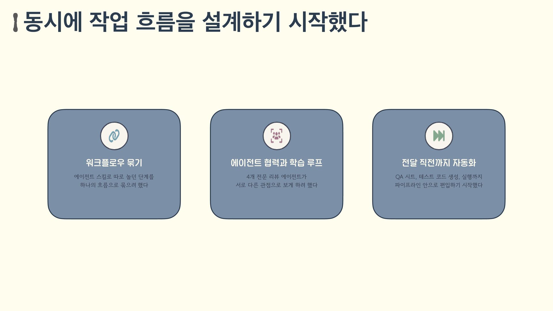 따로 놀던 단계를 하나의 흐름으로 묶으려 했다 4개 전문 리뷰 에이전트가 서로 다른 관점으로 보게 하려 했다 QA 시트, 테스트 코드 생성, 실행까지 파이프라인 안으로 편입하기 시작했다