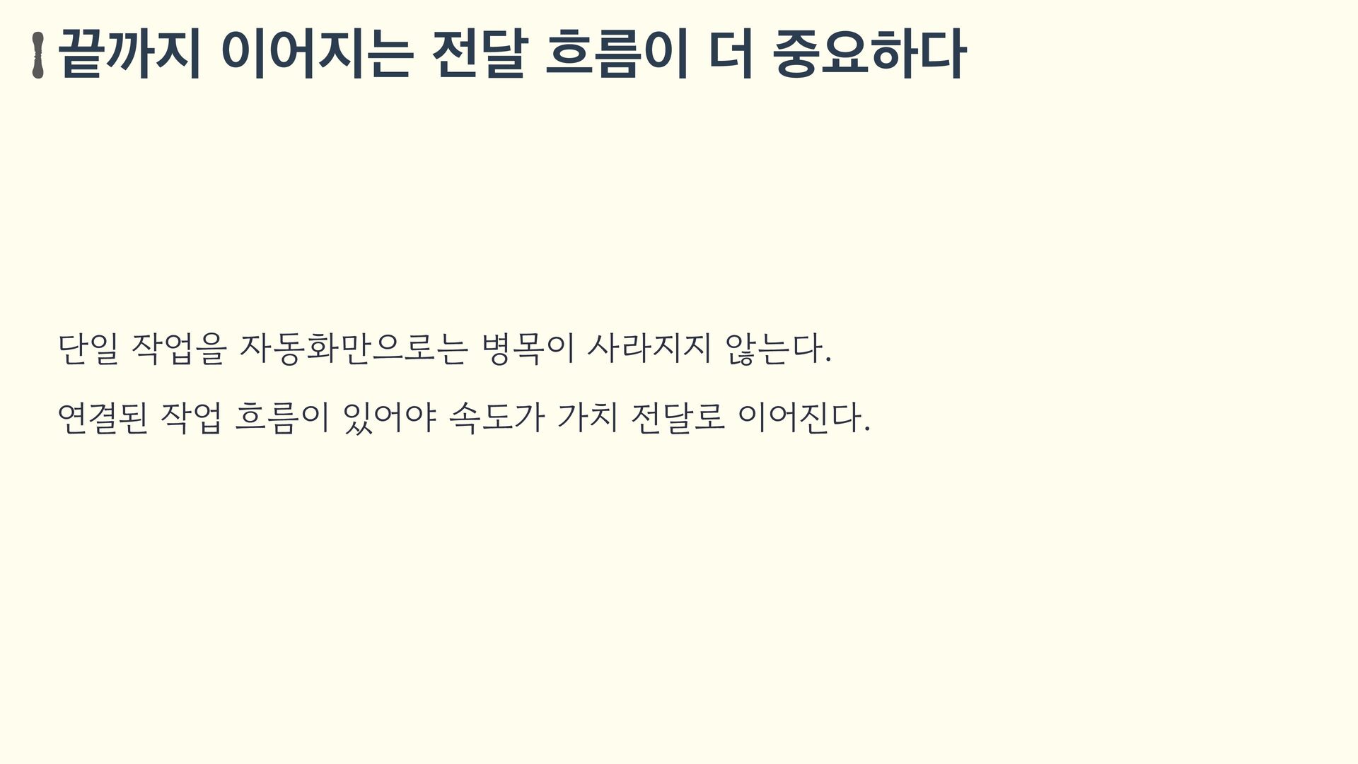 속도가 가치 전달로 이어진다. 단일 작업을 자동화만으로는 병목이 사라지지 않는다.
