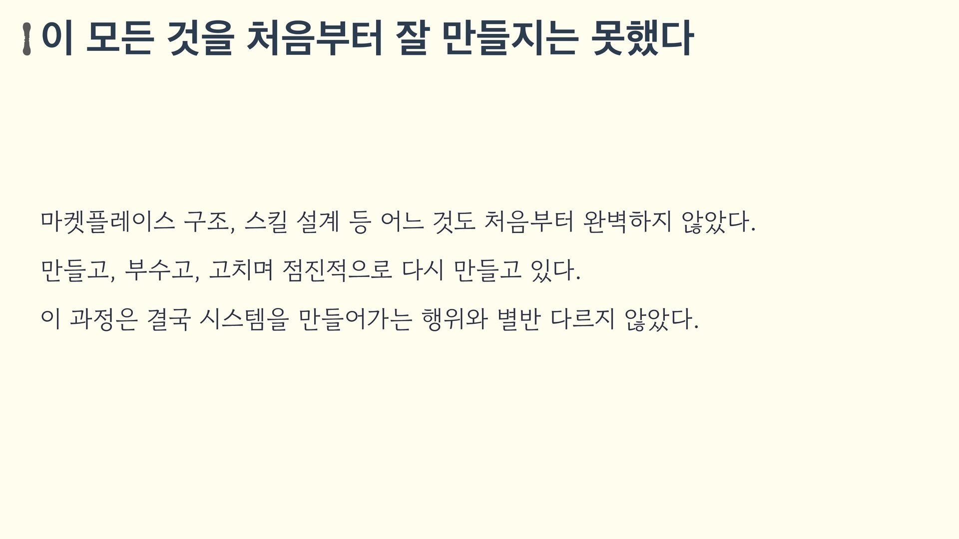 시스템을 만들어가는 행위와 별반 다르지 않았다. 만들고, 부수고, 고치며 점진적으로 다시 만들고 있다. 마켓플레이스 구조, 스킬 설계 등 어느 것도 처음부터 완벽하지 않았다.
