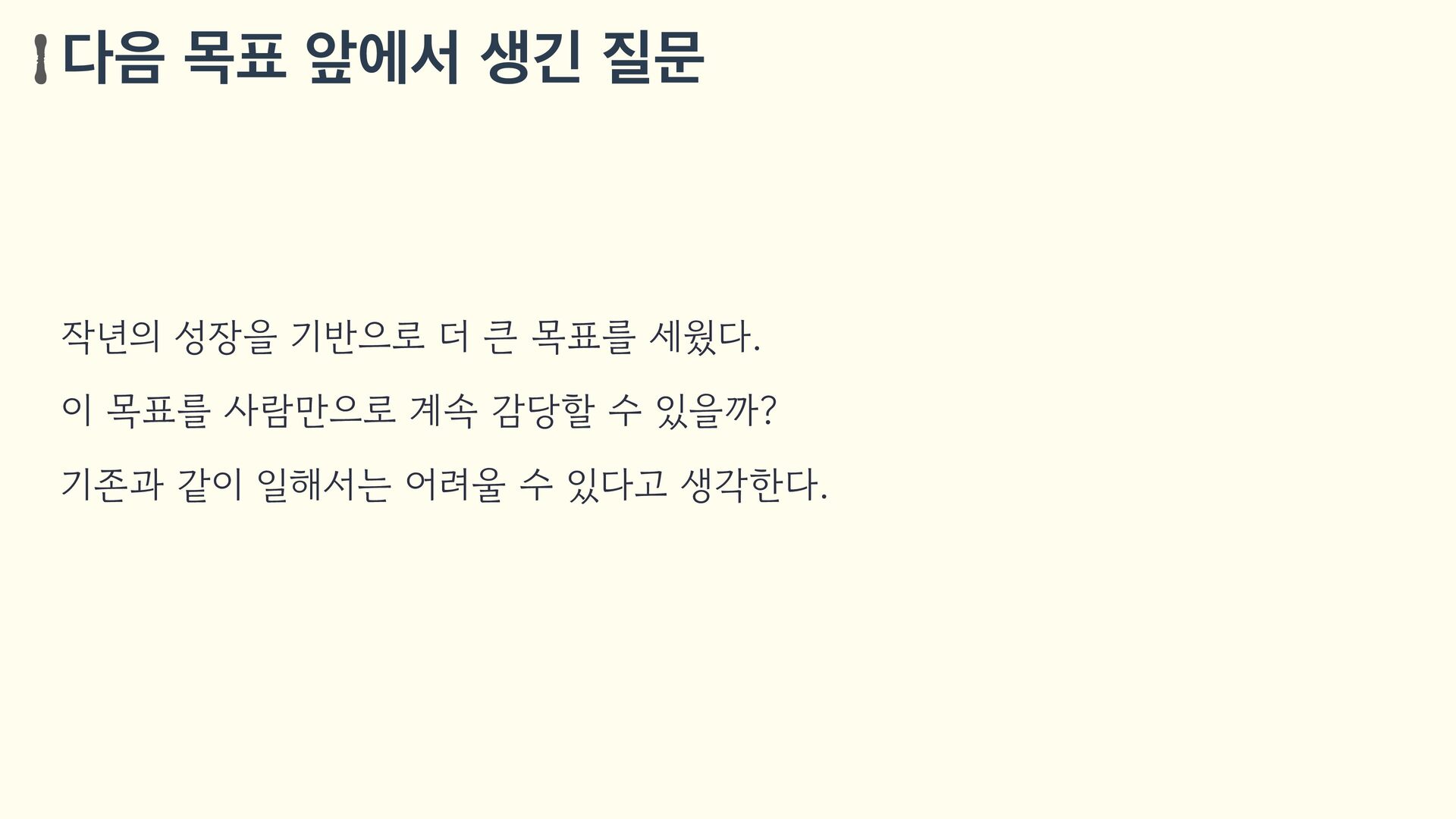 있다고 생각한다. 이 목표를 사람만으로 계속 감당할 수 있을까? 작년의 성장을 기반으로 더 큰 목표를 세웠다.