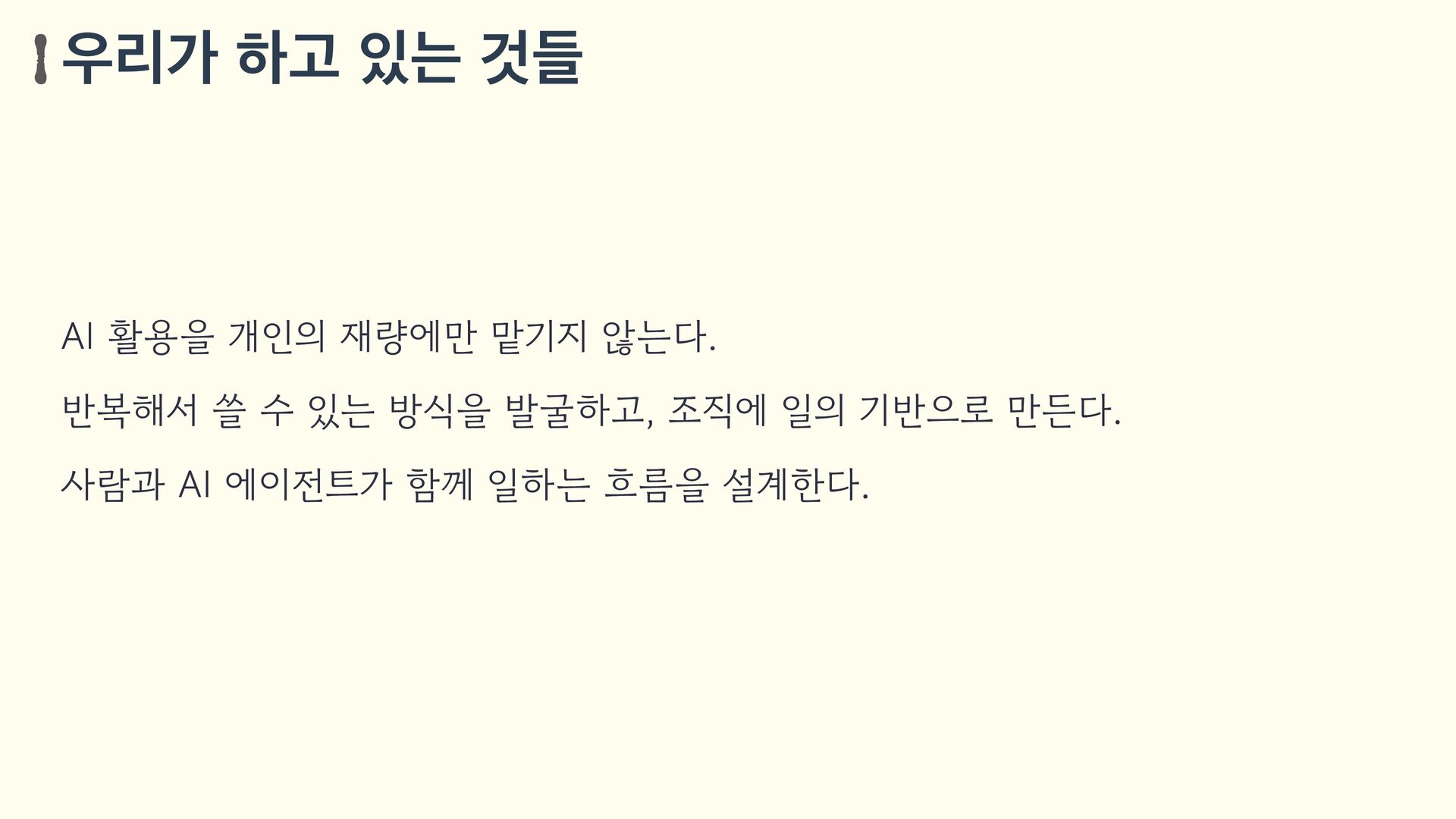 설계한다. 반복해서 쓸 수 있는 방식을 발굴하고, 조직에 일의 기반으로 만든다. AI 활용을 개인의 재량에만 맡기지 않는다.