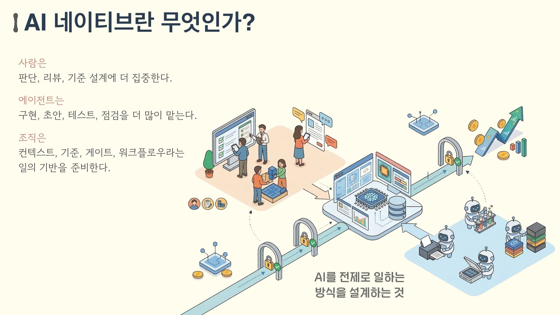 지금 시점에서 사람은 판단/검증 기준 설계로 올라가고, 에이전트는 구현/초안/테스트/검증을 더 많이 맡고, 조직은 그 둘이 함께 일할 수 있도록 컨텍스트/워크플로우라는 기반을 제공하는 것을 AI 네이티브라고 정의하기로 했습니다.