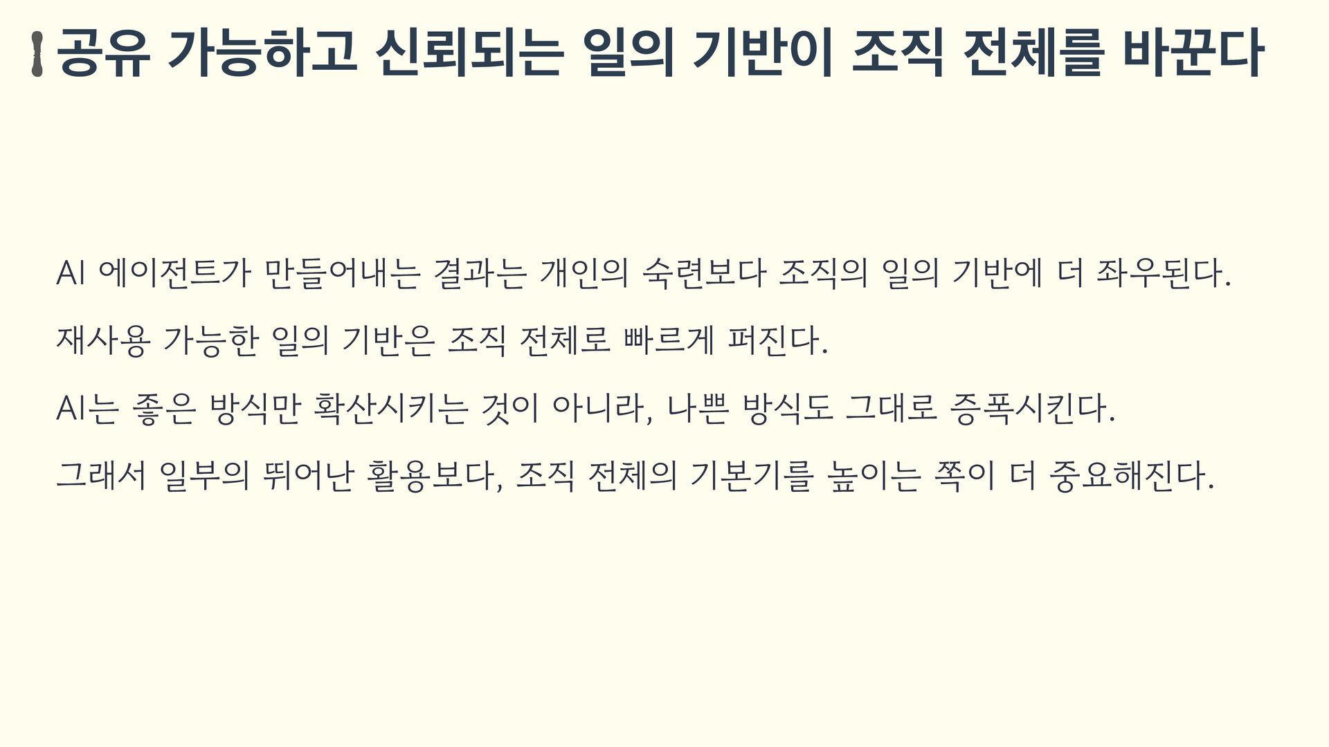 방식만 확산시키는 것이 아니라, 나쁜 방식도 그대로 증폭시킨다. 재사용 가능한 일의 기반은 조직 전체로 빠르게 퍼진다. AI 에이전트가 만들어내는 결과는 개인의 숙련보다 조직의 일의 기반에 더 좌우된다. 그래서 일부의 뛰어난 활용보다, 조직 전체의 기본기를 높이는 쪽이 더 중요해진다.