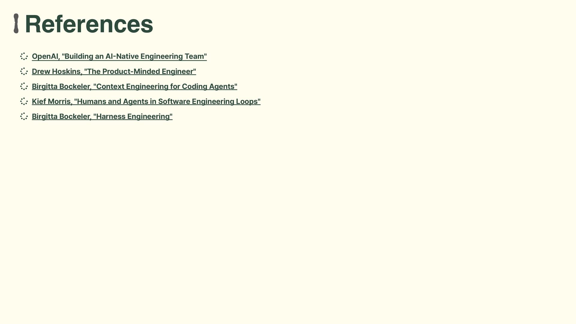 Drew Hoskins, The Product Minded Engineer 👤 Birgitta Bockeler, Context Engineering for Coding Agents 👤 Kief Morris, Humans and Agents in Software Engineering Loops 👤 Birgitta Bockeler, Harness Engineering
