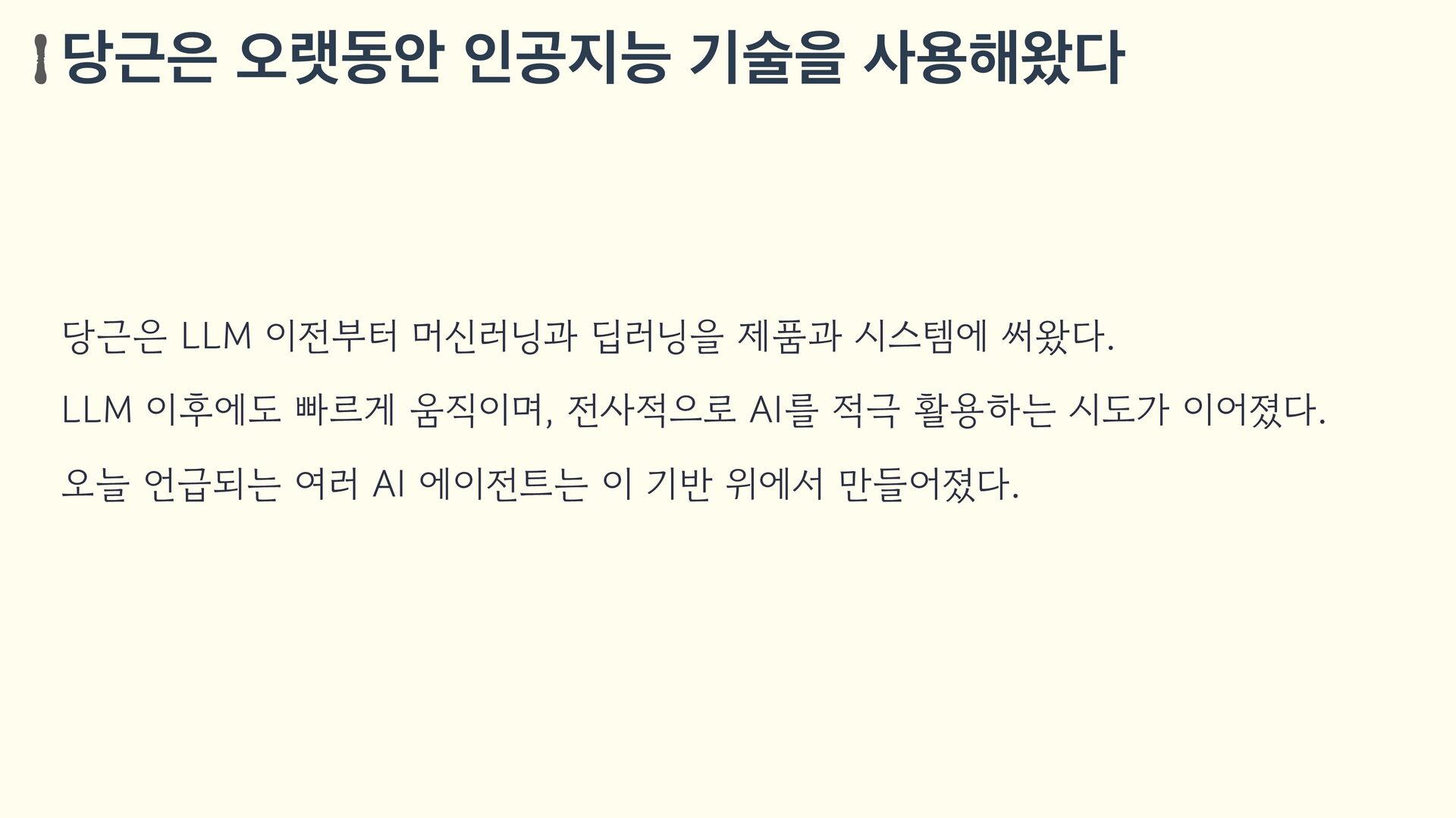 이 기반 위에서 만들어졌다. LLM 이후에도 빠르게 움직이며, 전사적으로 AI를 적극 활용하는 시도가 이어졌다. 당근은 LLM 이전부터 머신러닝과 딥러닝을 제품과 시스템에 써왔다.