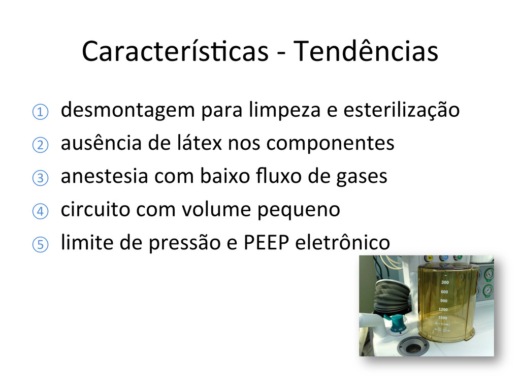 ② ausência de látex nos componentes ③ anestesia com baixo fluxo de gases ④ circuito com volume pequeno ⑤ limite de pressão e PEEP eletrônico