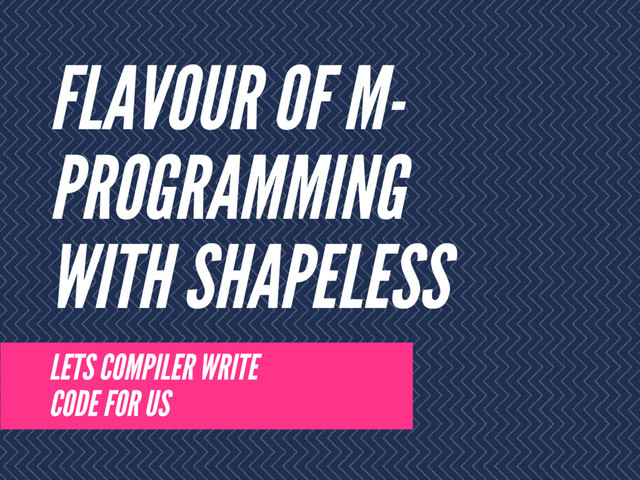 M - P R O G R A M M I N G W I T H S H A P E L E S S Library that implements heterogeneous list and bunch of macroses for it implicitly[Transformer[String :: Int :: Nil]].transform(ourHList) Search for implicit to convert HList[A, B] Build HList[String, HList[B, C]] Search for implicit to convert String Search for implicit to convert Int and Nil Provide converter from HList[Int, Nil] to Seq[String] Provide converter from HList[String, HList[Int, Nil]] to Seq!