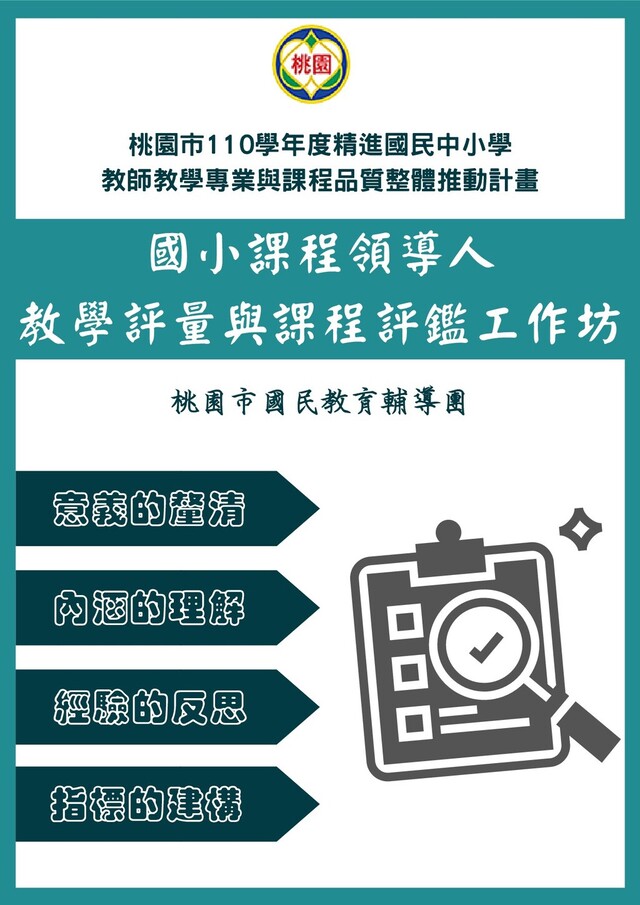 —彈性學習課程的回 觀與再行動 國教院退休研究員范信賢教 授(主講)、基隆市仁愛國小 彭麗琦校長及清大附設實驗 國小黃珮貞主任 (助理講師) 110.11.15 (一) 9:00-16:00 富岡國小 活動中心 第 4 群組 教學評量與課程評鑑 —彈性學習課程的回 觀與再行動 新竹市關埔國小陳思玎校長 (主講) 、國教院退休研究員 范信賢教授及清大附設實驗 國小黃珮貞主任 (助理講師) 110.11.19 (五) 9:00-16:00 六、 課程規劃﹙如附件一﹚: (一) 帶領各校課程領導人認識課綱課程評鑑的價值、意義、內涵與做法;理解校訂彈 性課程的評鑑重點。 (二) 透過同儕學習與實作,具備擬定符應新課綱之課程評鑑指標的能力。 (三) 依據課程評鑑的指標,檢視各校的彈性課程,提出精進校訂彈性課程評鑑之行 動策略。 七、 差勤及假別: 參與本活動之人員核予公(差)假登記及課務排代,所遺課務得依規定聘請代課教師 並得支領代課鐘點,由本局地方教育發展基金 110 年度學校預算〜用人費用〜聘僱 及兼職人員薪資〜兼職人員酬金項下支應,倘有不足再行由本局一併辦理補助作 業。 八、 經費: 由「教育部補助直轄市縣(市)政府精進國民中學及國民小學教師教學專業與課程品 質作業要點」補助及「桃園市政府教育局地方教育發展基金」相關預算補助支應; 概算表如附件二。 九、 預期效益 (一) 落實推動十二年國民基本教育課程綱要總綱之核心素養與課程目標,並能透過 團隊實作工作坊了解課程評鑑之重要。 (二) 經由研習與實作了解素養導向課程設計、教學與評量之重要。 (三) 透過學校課程領導人的共學、共作提升對新課綱的理解與實踐。 (四) 啟動課程評鑑機制,落實課程滾動式修正的省思回饋策略。 十、 獎勵 依據「公立高級中等以下學校校長成績考核辦法」、「公立高級中等以下學校教師 成績考核辦法」及「桃園市市立各級學校及幼兒園教職員獎懲要點」規定辦理。 十一、 本計畫陳 教育部國民及學前教育署與市府教育局核准後實施,修正時亦同。 2