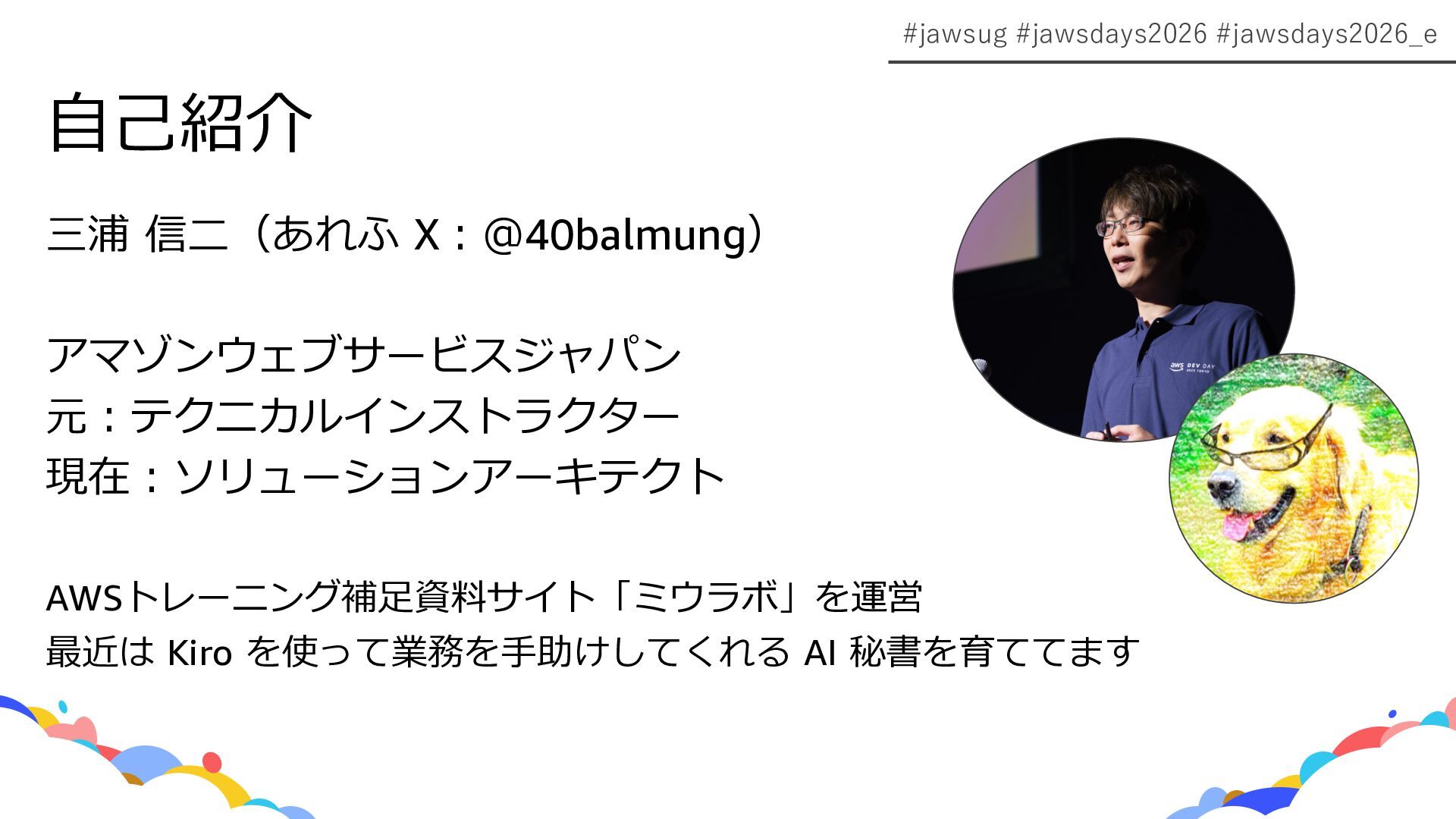#jawsug #jawsdays2026 #jawsdays2026_e 三浦 信⼆(あれふ X︓@40balmung) アマゾンウェブサービスジャパン 元︓テクニカルインストラクター 現在︓ソリューションアーキテクト AWSトレーニング補⾜資料サイト「ミウラボ」を運営