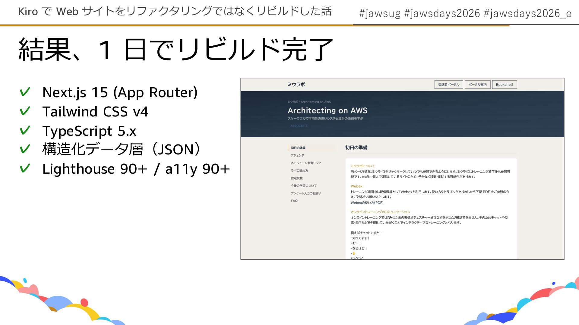 #jawsug #jawsdays2026 #jawsdays2026_e 結果、1 ⽇でリビルド完了 Kiro で Web サイトをリファクタリングではなくリビルドした話 ✓