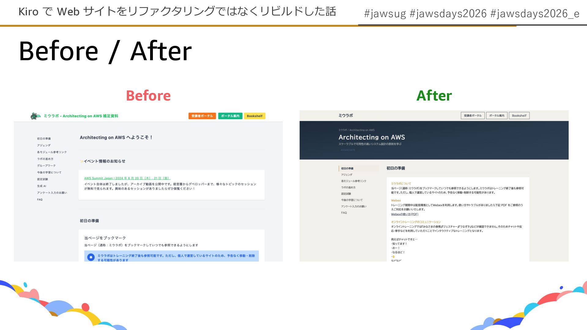 #jawsug #jawsdays2026 #jawsdays2026_e Before / After Kiro で Web サイトをリファクタリングではなくリビルドした話