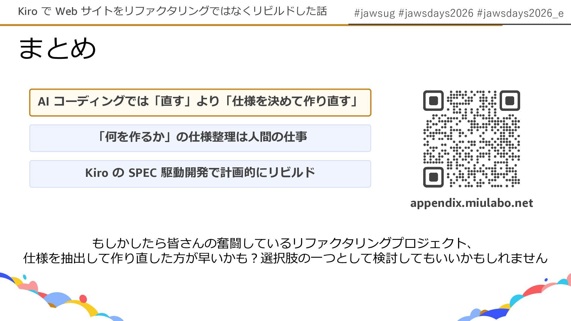 #jawsug #jawsdays2026 #jawsdays2026_e まとめ Kiro で Web サイトをリファクタリングではなくリビルドした話 AI コーディングでは「直す」より「仕様を決めて作り直す」
