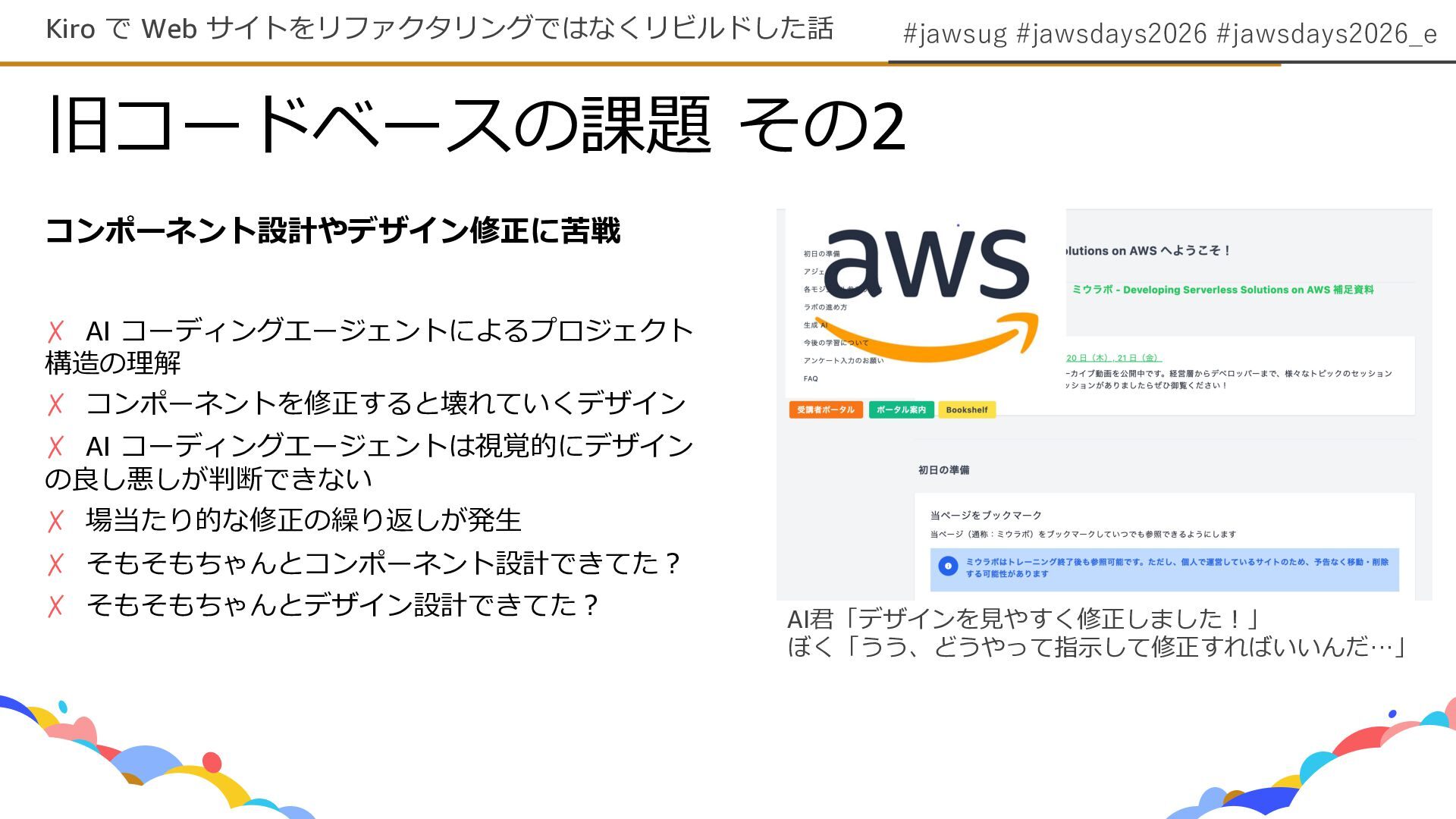 #jawsug #jawsdays2026 #jawsdays2026_e 旧コードベースの課題 その2 Kiro で Web サイトをリファクタリングではなくリビルドした話 コンポーネント設計やデザイン修正に苦戦
