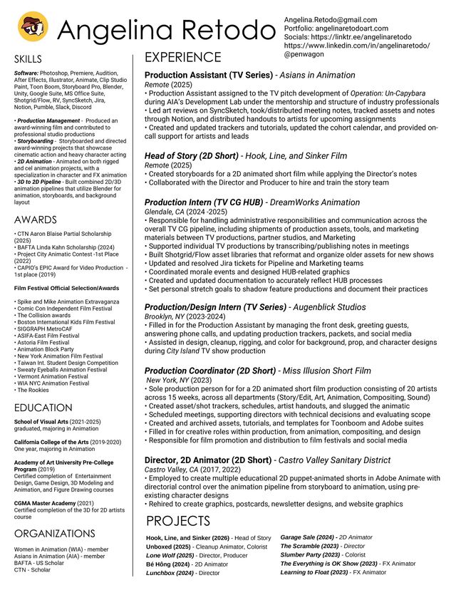 [email protected] Portfolio: angelinaretodoart.com Socials: https://linktr.ee/angelinaretodo https://www.linkedin.com/in/angelinaretodo/ @penwagon EXPERIENCE Production Assistant (TV Series) - Asians in Animation Remote (2025) • Production Assistant assigned to the TV pitch development of Operation: Un-Capybara during AIA’s Development Lab under the mentorship and structure of industry professionals • Led art reviews on SyncSketch, took/distributed meeting notes, tracked assets and notes through Notion, and distributed handouts to artists for upcoming assignments • Created and updated trackers and tutorials, updated the cohort calendar, and provided on- call support for artists and leads Head of Story (2D Short) - Hook, Line, and Sinker Film Remote (2025) • Created storyboards for a 2D animated short film while applying the Director’s notes • Collaborated with the Director and Producer to hire and train the story team Production Intern (TV CG HUB) - DreamWorks Animation Glendale, CA (2024 -2025) • Responsible for handling administrative responsibilities and communication across the overall TV CG pipeline, including shipments of production assets, tools, and marketing materials between TV productions, partner studios, and Marketing • Supported individual TV productions by transcribing/publishing notes in meetings • Built Shotgrid/Flow asset libraries that reformat and organize older assets for new shows • Updated and resolved Jira tickets for Pipeline and Marketing teams • Coordinated morale events and designed HUB-related graphics • Created and updated documentation to accurately reflect HUB processes • Set personal stretch goals to shadow feature productions and document their practices Production/Design Intern (TV Series) - Augenblick Studios Brooklyn, NY (2023-2024) • Filled in for the Production Assistant by managing the front desk, greeting guests, answering phone calls, and updating production trackers, packets, and social media • Assisted in design, cleanup, rigging, and color for background, prop, and character designs during City Island TV show production Production Coordinator (2D Short) - Miss Illusion Short Film New York, NY (2023) • Sole production person for for a 2D animated short film production consisting of 20 artists across 15 weeks, across all departments (Story/Edit, Art, Animation, Compositing, Sound) • Created asset/shot trackers, schedules, artist handouts, and slugged the animatic • Scheduled meetings, supporting directors with technical decisions and evaluating scope • Created and archived assets, tutorials, and templates for Toonboom and Adobe suites • Filled in for creative roles within production, from animation, compositing, and design • Responsible for film promotion and distribution to film festivals and social media Director, 2D Animator (2D Short) - Castro Valley Sanitary District Castro Valley, CA (2017, 2022) • Employed to create multiple educational 2D puppet-animated shorts in Adobe Animate with directorial control over the animation pipeline from storyboard to animation, using pre- existing character designs • Rehired to create graphics, postcards, newsletter designs, and website graphics PROJECTS Hook, Line, and Sinker (2026) - Head of Story Unboxed (2025) - Cleanup Animator, Colorist Lone Wolf (2025) - Director, Producer Bé Hông (2024) - 2D Animator Lunchbox (2024) - Director Garage Sale (2024) - 2D Animator The Scramble (2023) - Director Slumber Party (2023) - Colorist The Everything is OK Show (2023) - FX Animator Learning to Float (2023) - FX Animator
