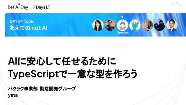 TypeScriptで一意な型を作ったけど AIには任せられなかった 😭 バクラク事業部 勤怠開発グループ yata YATA, Yuki DAY04 topic