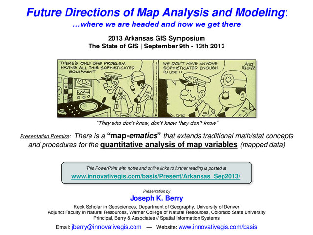 headed and how we get there Presentation by Joseph K. Berry Keck Scholar in Geosciences, Department of Geography, University of Denver Adjunct Faculty in Natural Resources, Warner College of Natural Resources, Colorado State University Principal, Berry & Associates // Spatial Information Systems Email: [email protected] — Website: www.innovativegis.com/basis This PowerPoint with notes and online links to further reading is posted at www.innovativegis.com/basis/Present/Arkansas_Sep2013/ 2013 Arkansas GIS Symposium The State of GIS | September 9th - 13th 2013 Presentation Premise: There is a “map-ematics” that extends traditional math/stat concepts and procedures for the quantitative analysis of map variables (mapped data) “They who don’t know, don’t know they don’t know”